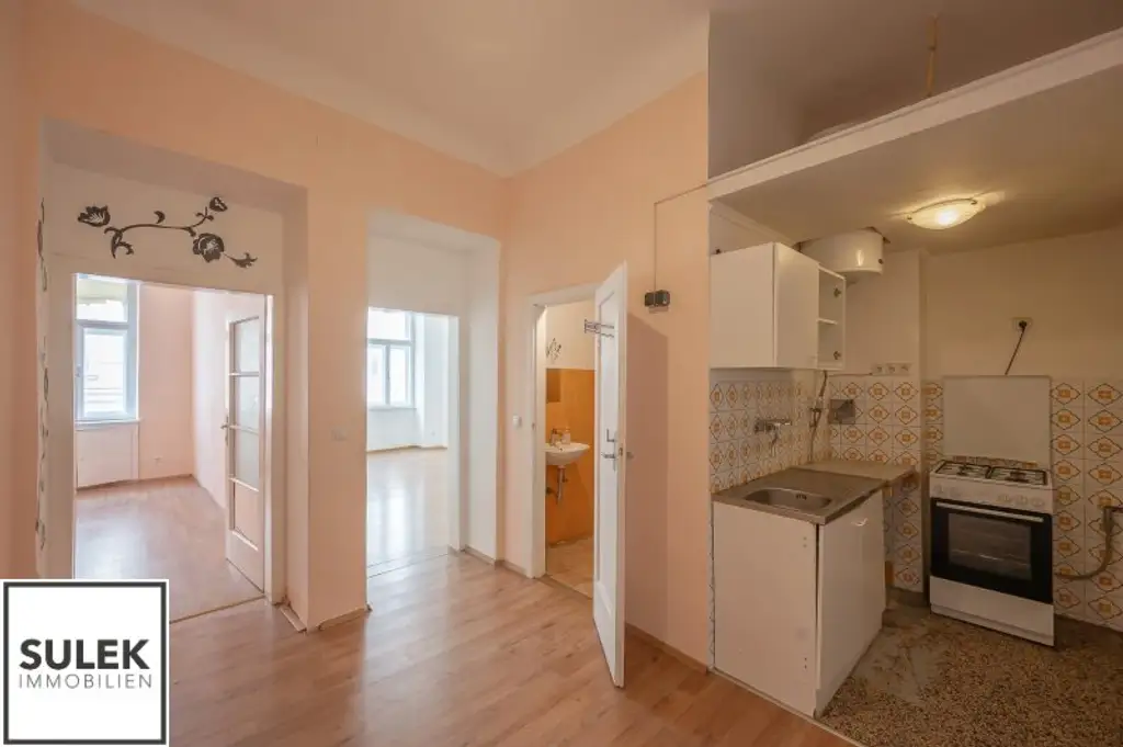 Zum Verkauf steht eine sanierungsbedürftige 2 Zimmer Wohnung im 1. Liftstock eines gepflegten Altbaus mit einer Größe von rd. 45m², wobei es zwischen Erdgeschoss und dem 1.OG ein Zwischengeschoss (Mezzanin) gibt.