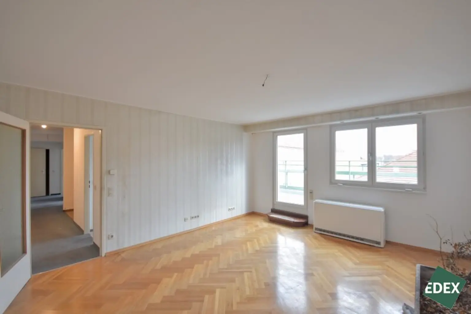 Vom Vorraum aus sind sämtliche Räume zentral begehbar. Die Wohnung verfügt über drei gut geschnittene Zimmer, wovon zwei direkten Zugang zur großzügigen, ca. 21,50 m² großen Terrasse bieten – ein besonderes Highlight dieser Immobilie. Die Terrasse wurde kürzlich, im Zuge der Fassadensanierung, saniert und erweitert den Wohnraum ideal ins Freie.