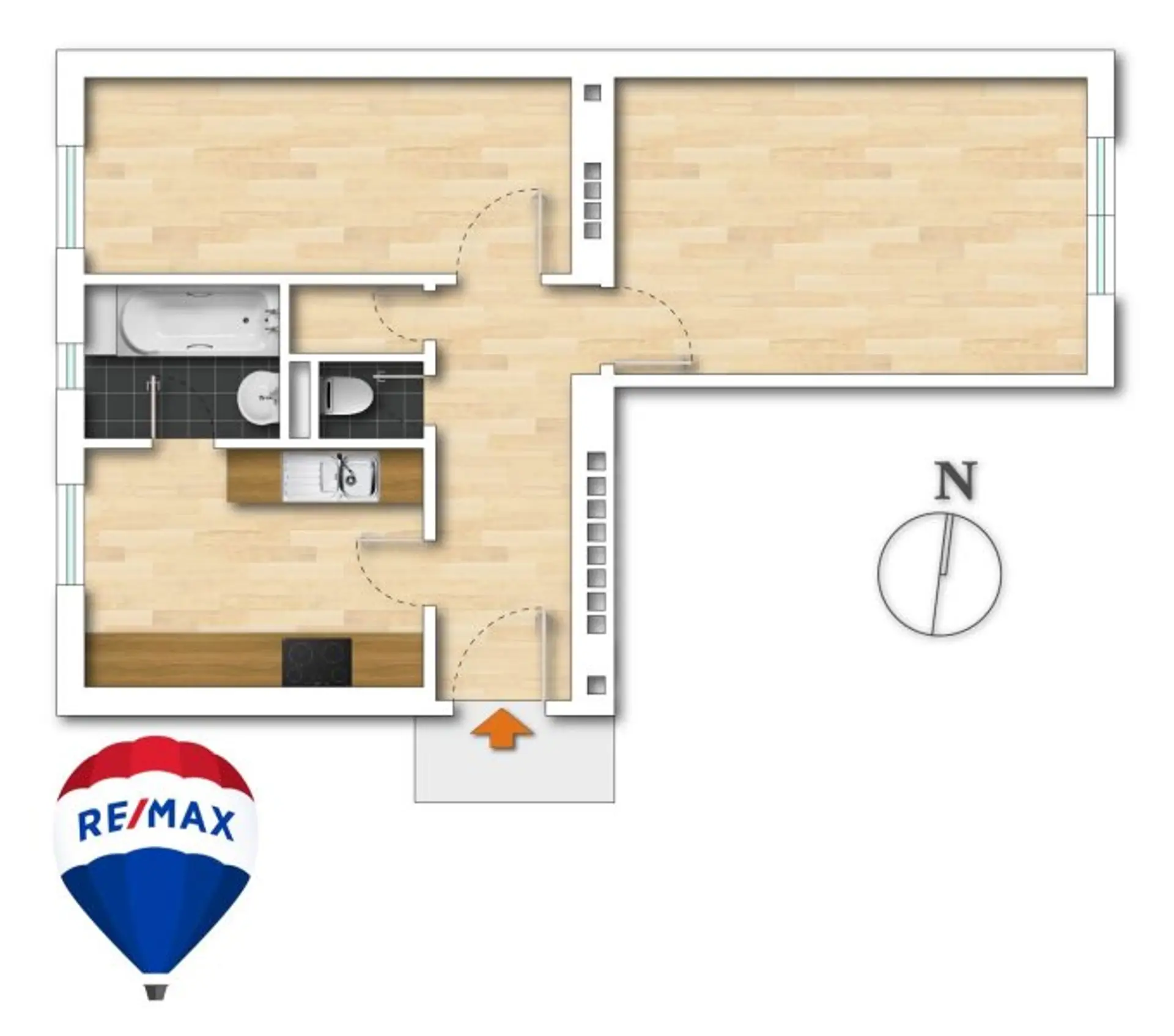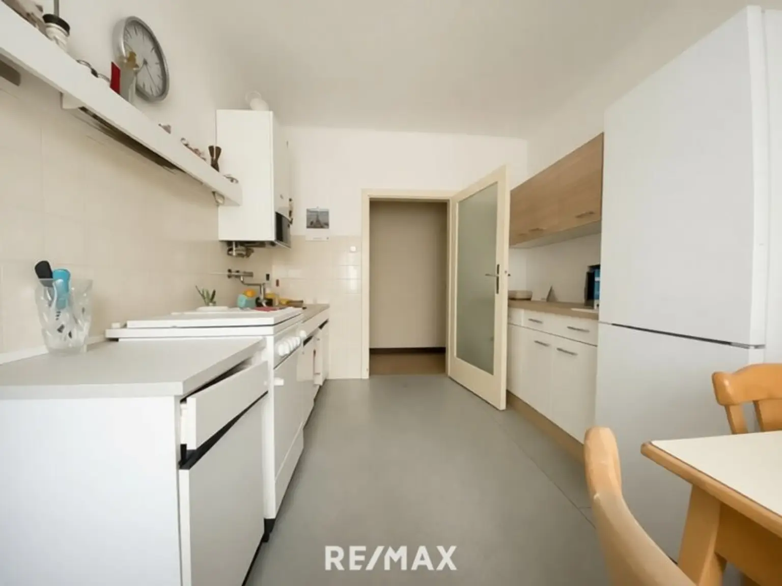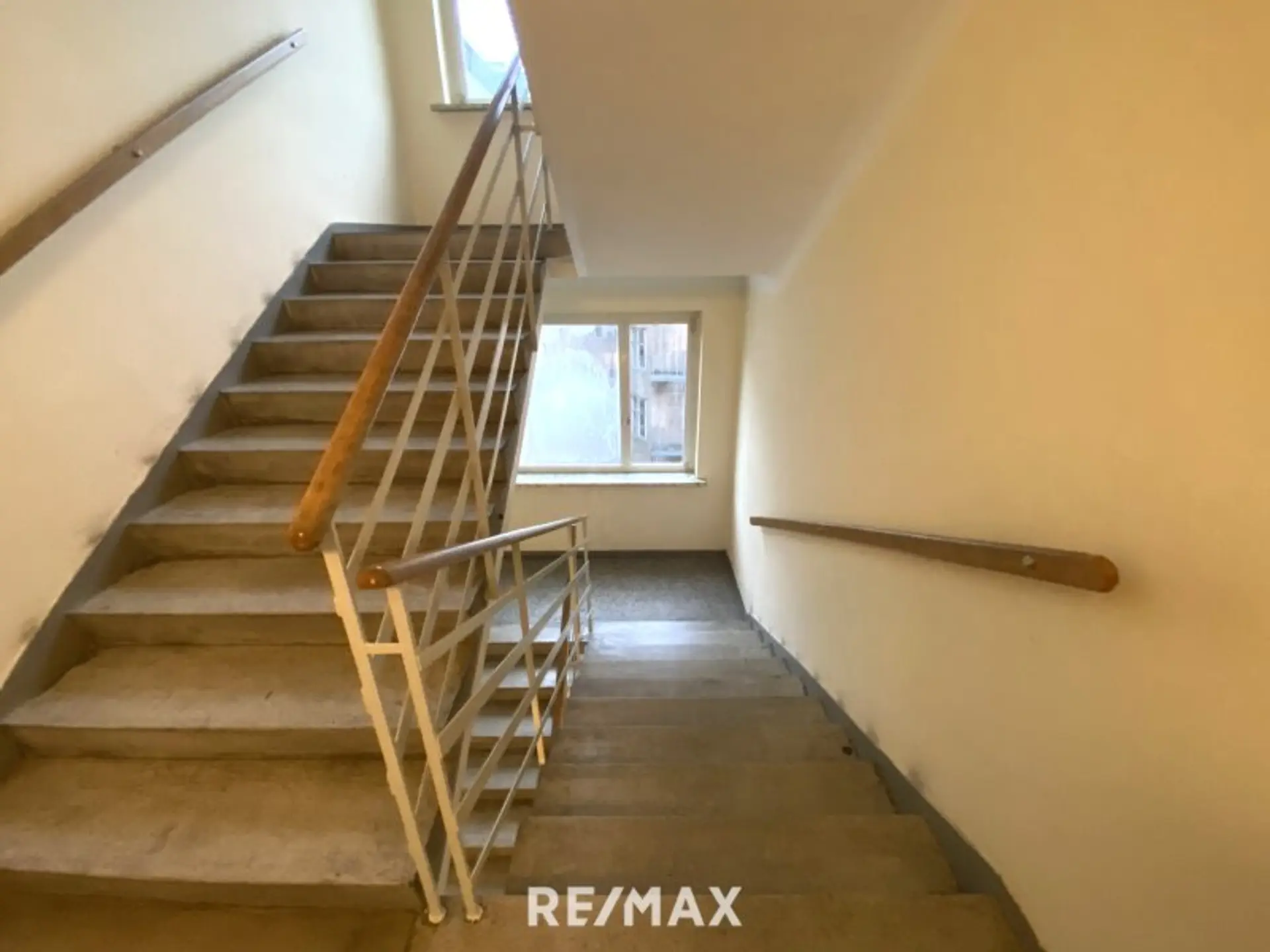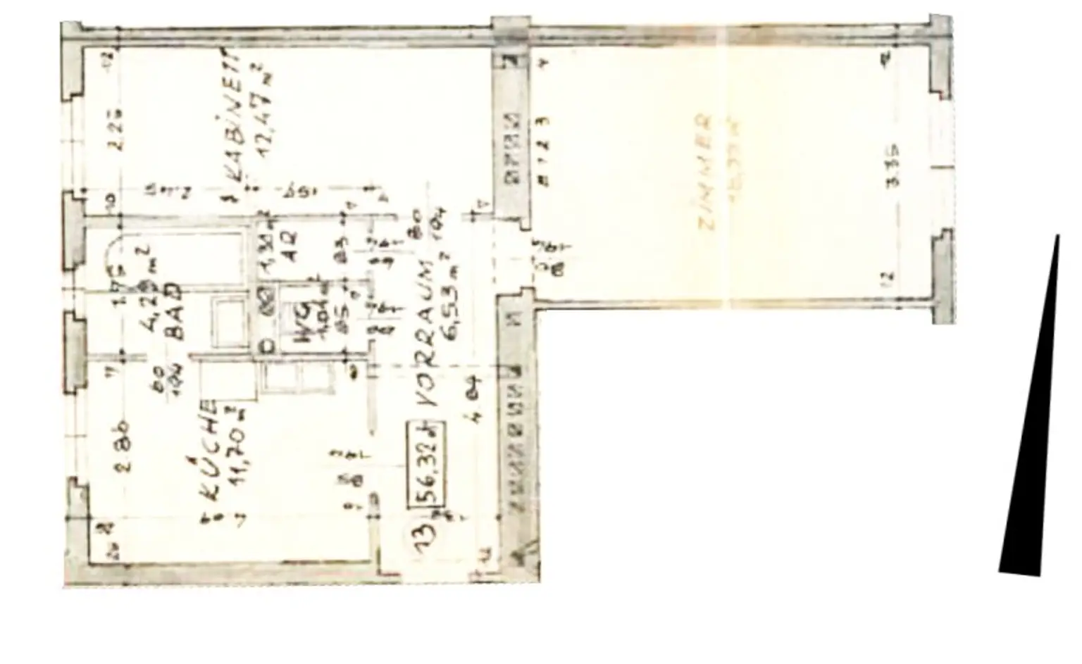 Aus dem zentralen Vorraum gelangen Sie in das ca. 19 m² große, ostseitige Wohnzimmer, das ca. 12 m² große, hof- und westseitige Zimmer, die ca. 12 m² große Küche mit Fenster, den Abstellraum und das separate WC. Das Bad mit Fenster können Sie über die Küche betreten.