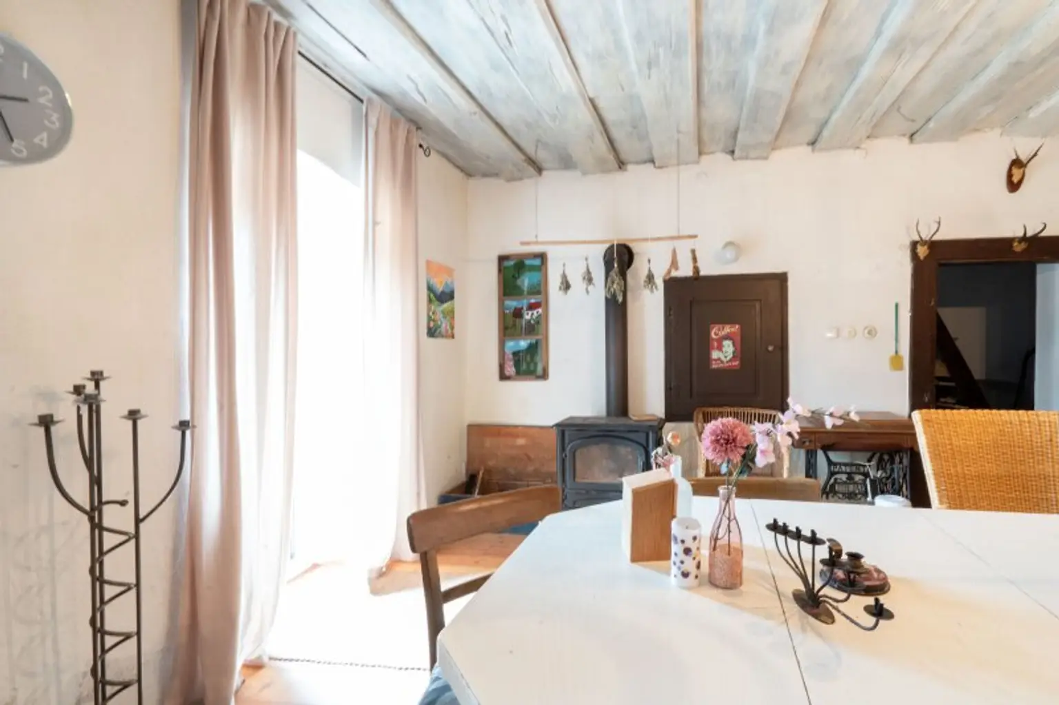 Herzstück des Hauses ist die einladende Stube, die durch gleich drei traditionelle Kachelöfen zusätzlich an Gemütlichkeit gewinnt – perfekt für behagliche Stunden an kühleren Tagen. Das Badezimmer ist funktional mit Badewanne und WC ausgestattet.