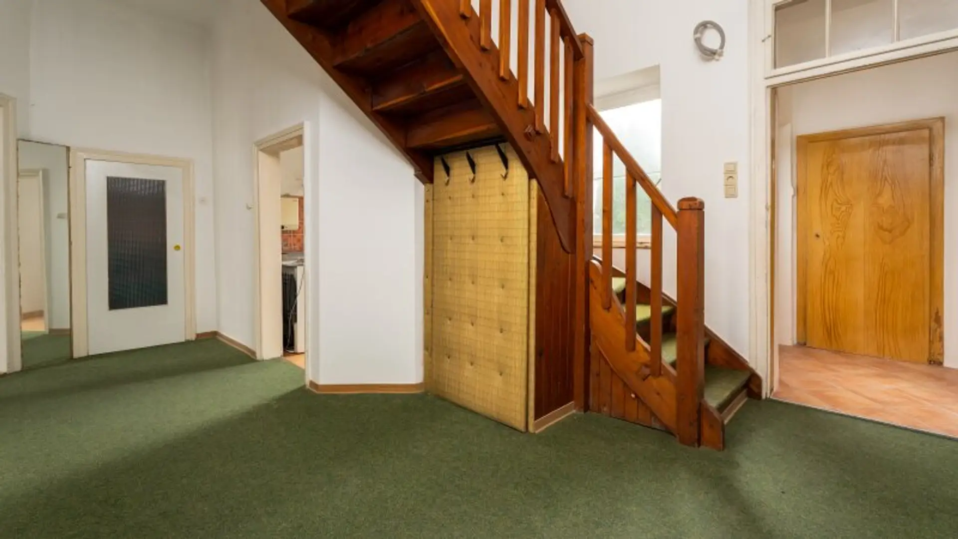 Im Vorraum von Wohneinheit 1 angekommen, steht Ihnen linkerhand der Abstellraum - ehemals Badezimmer, geradeaus die Küche und rechterhand 2 Zimmer zur Verfügung. Außerdem gelangen Sie vom Vorraum über den Stiegenaufgang in das Obergeschoß. Vom Vorraum des Obergeschoß gelangen Sie in 2 Zimmer sowie einen nicht ausgebauten Raum.