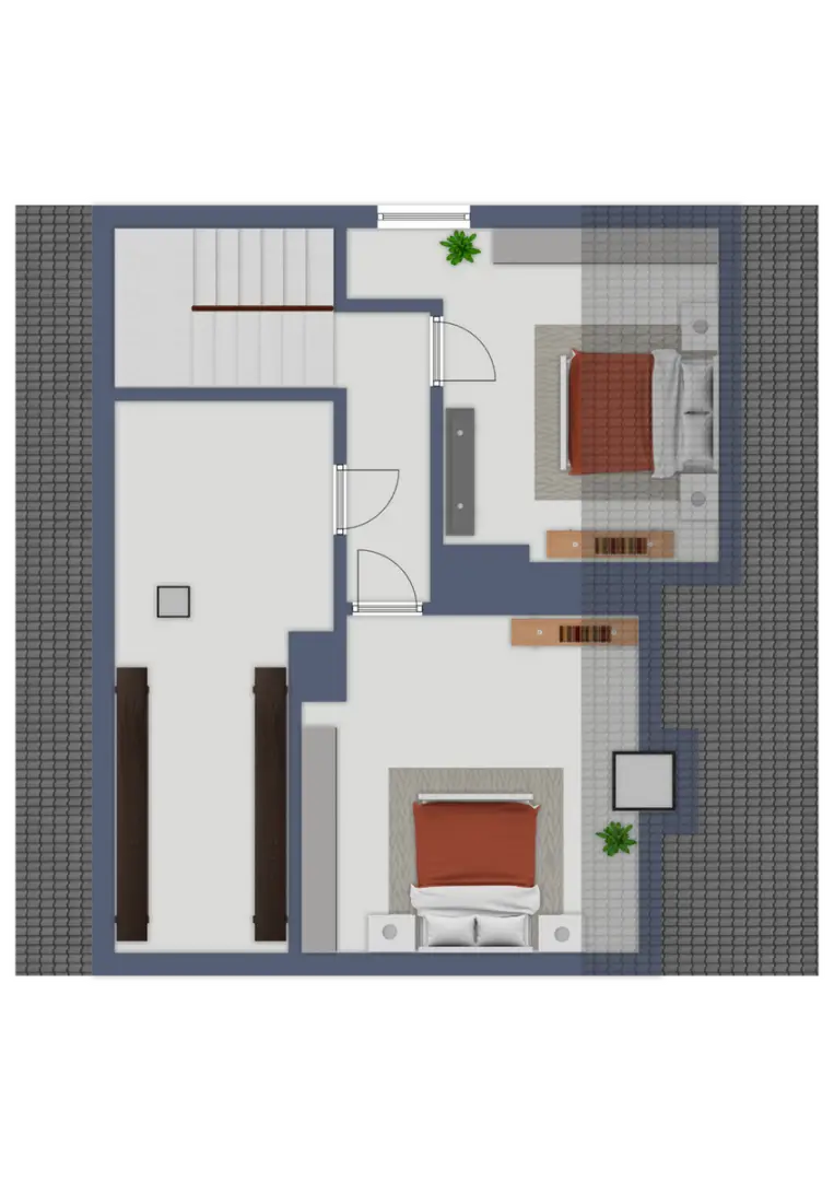 Vom Vorraum im Erdgeschoss aus gelangt man in einen Abstellraum. Über die Stiegen erreicht man das Obergeschoss, in dem ein Gang zu den Zimmern führt und gleichzeitig Zugang zur Terrasse bietet. Hier befinden sich ein Büro, ein Wohnzimmer, ein Badezimmer mit Badewanne, ein weiteres Zimmer sowie ein separates WC. Über weitere Stiegen gelangt man in das Dachgeschoss, wo zwei weitere Zimmer vorhanden sind. Der Dachboden bietet zusätzlichen Stauraum.