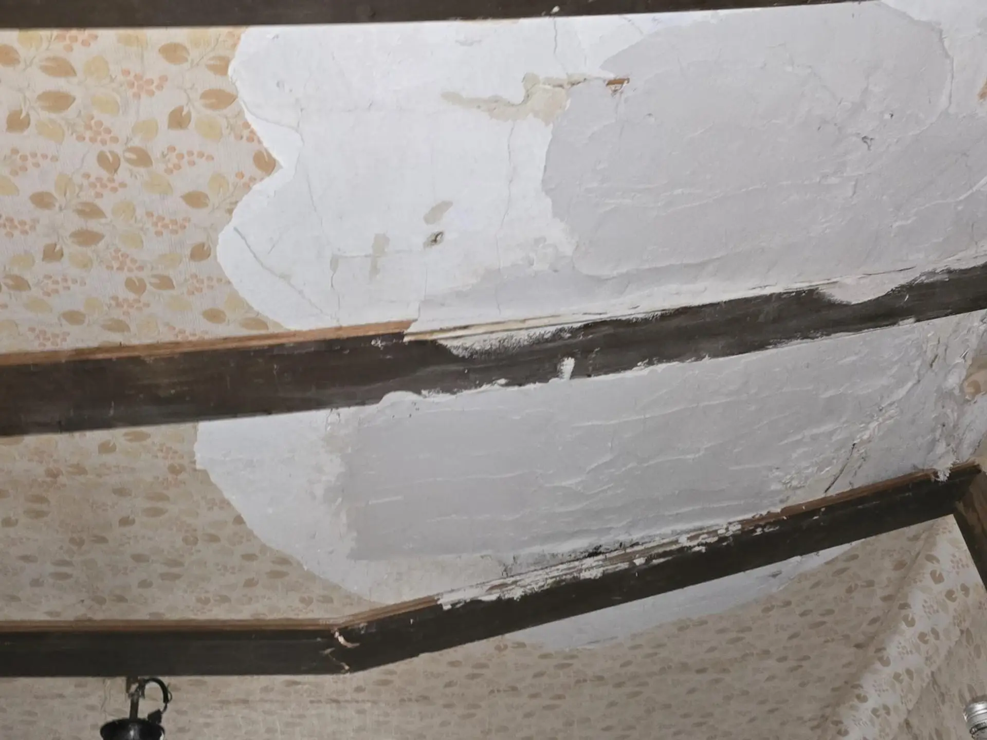 Auf den Bildern ist ersichtlich, dass das Dach, ein Holzbalken der Zwischendecke und die Scheune baufällig sind.