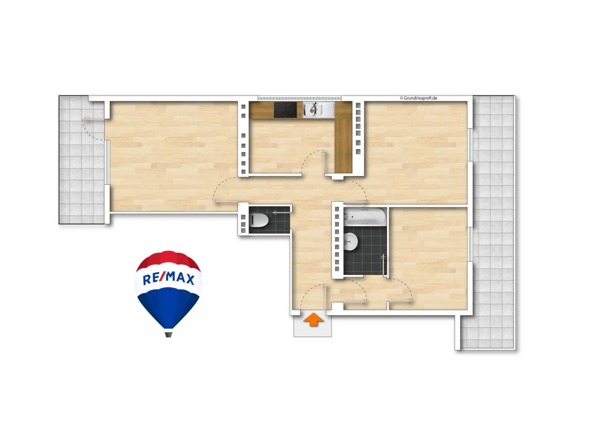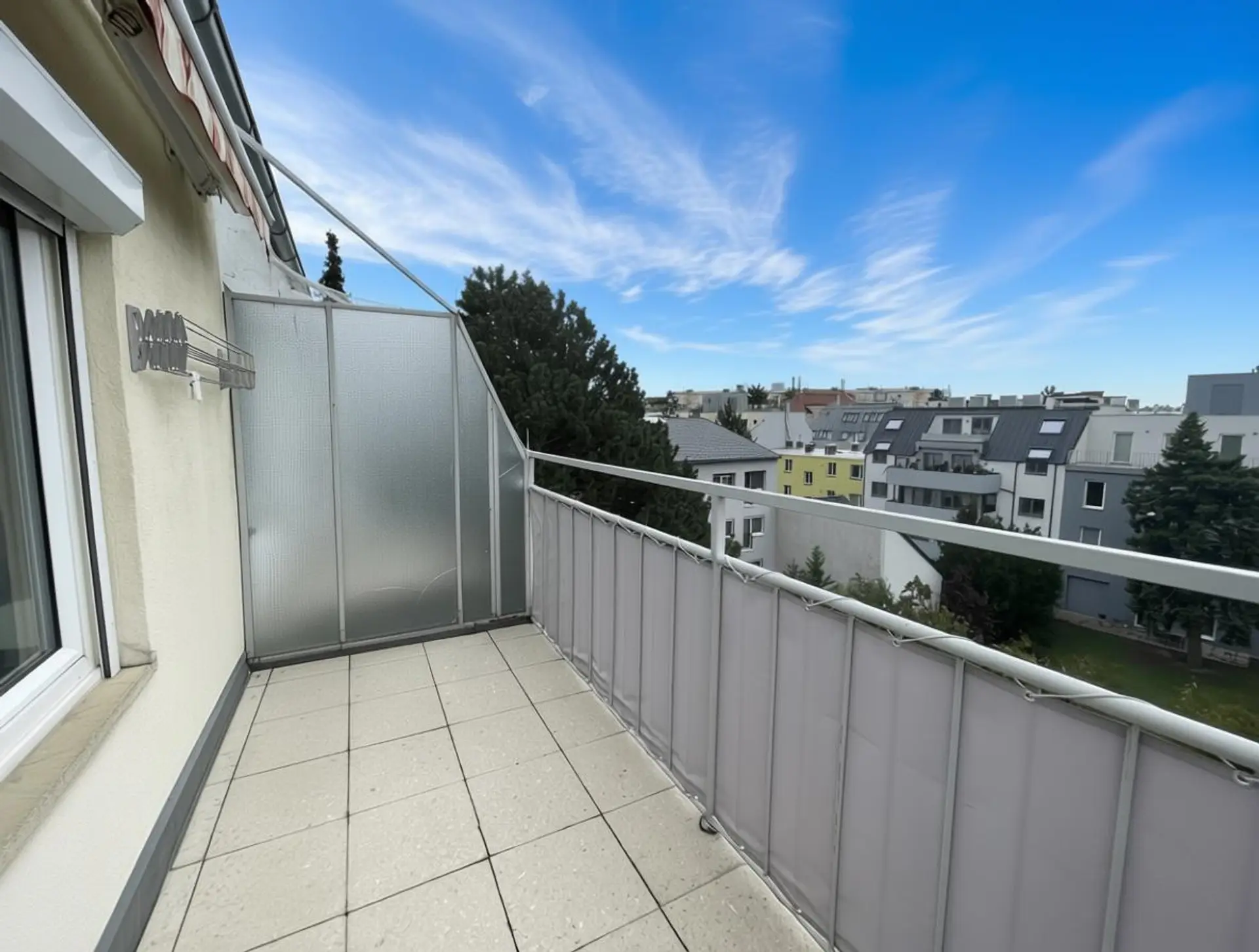 Die ca. 9 m² große, süd-west-seitige Terrasse können Sie vom Wohnzimmer aus betreten, die andere Terrasse mit ca. 12 m² und Nord-Ost-Ausrichtung aus den beiden anderen Zimmern.