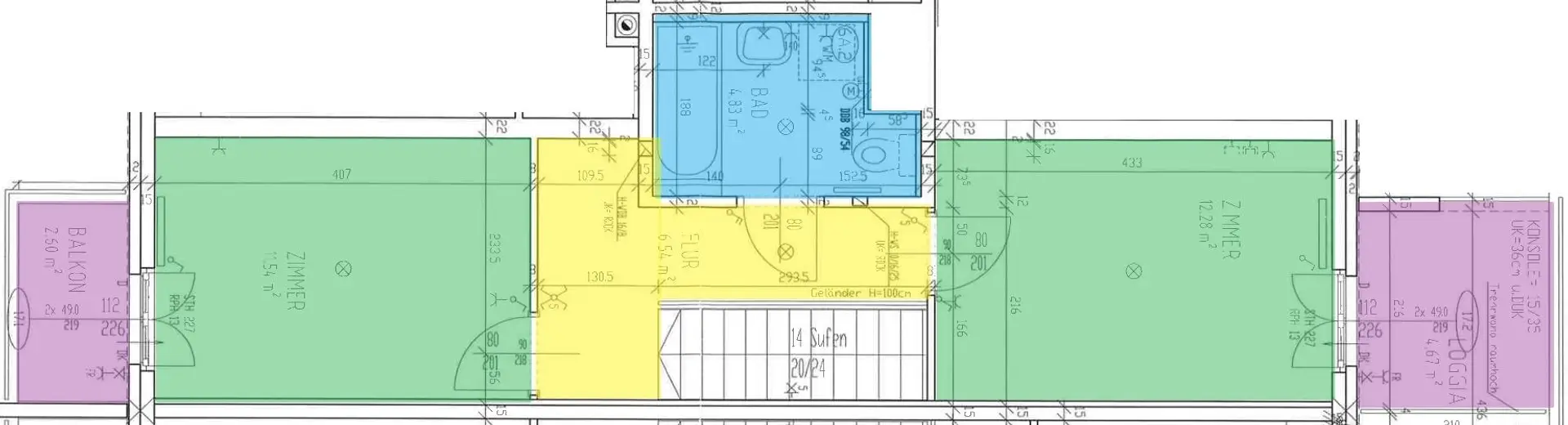 OG: Über die verflieste Treppe gelangt man ins Obergeschoss, wo sich 2 Schlafzimmer (beide mit Loggia oder Balkon) befinden, sowie das Bad inkl. WC und Waschmaschinenanschluss.