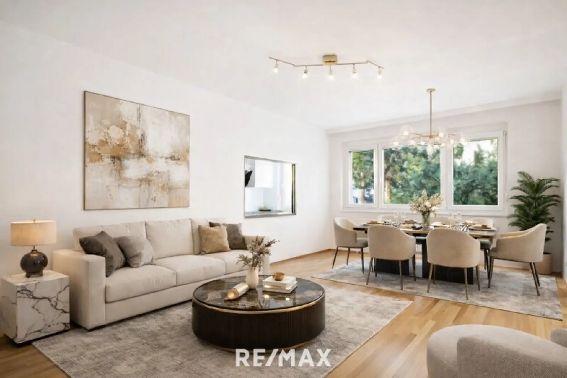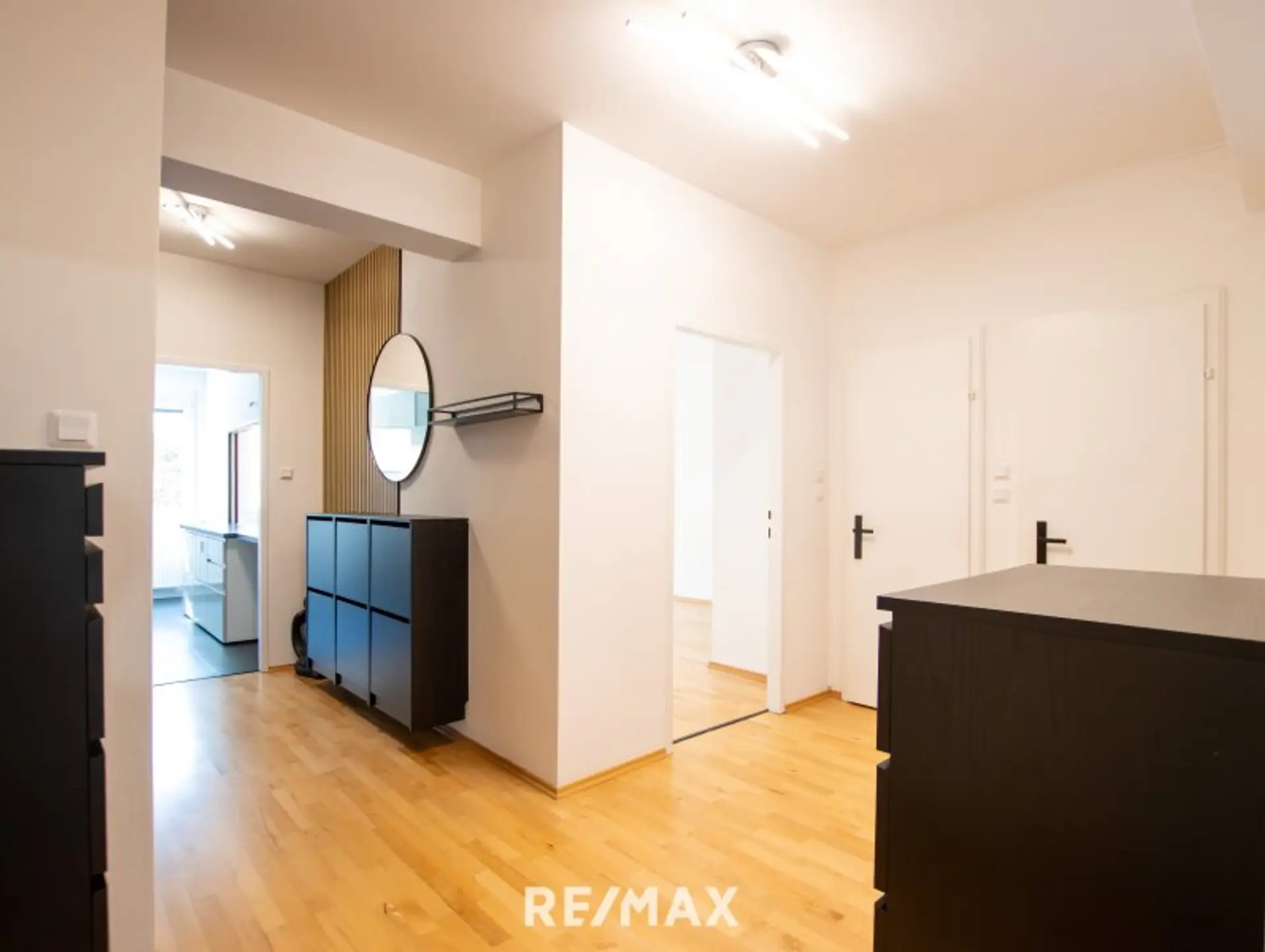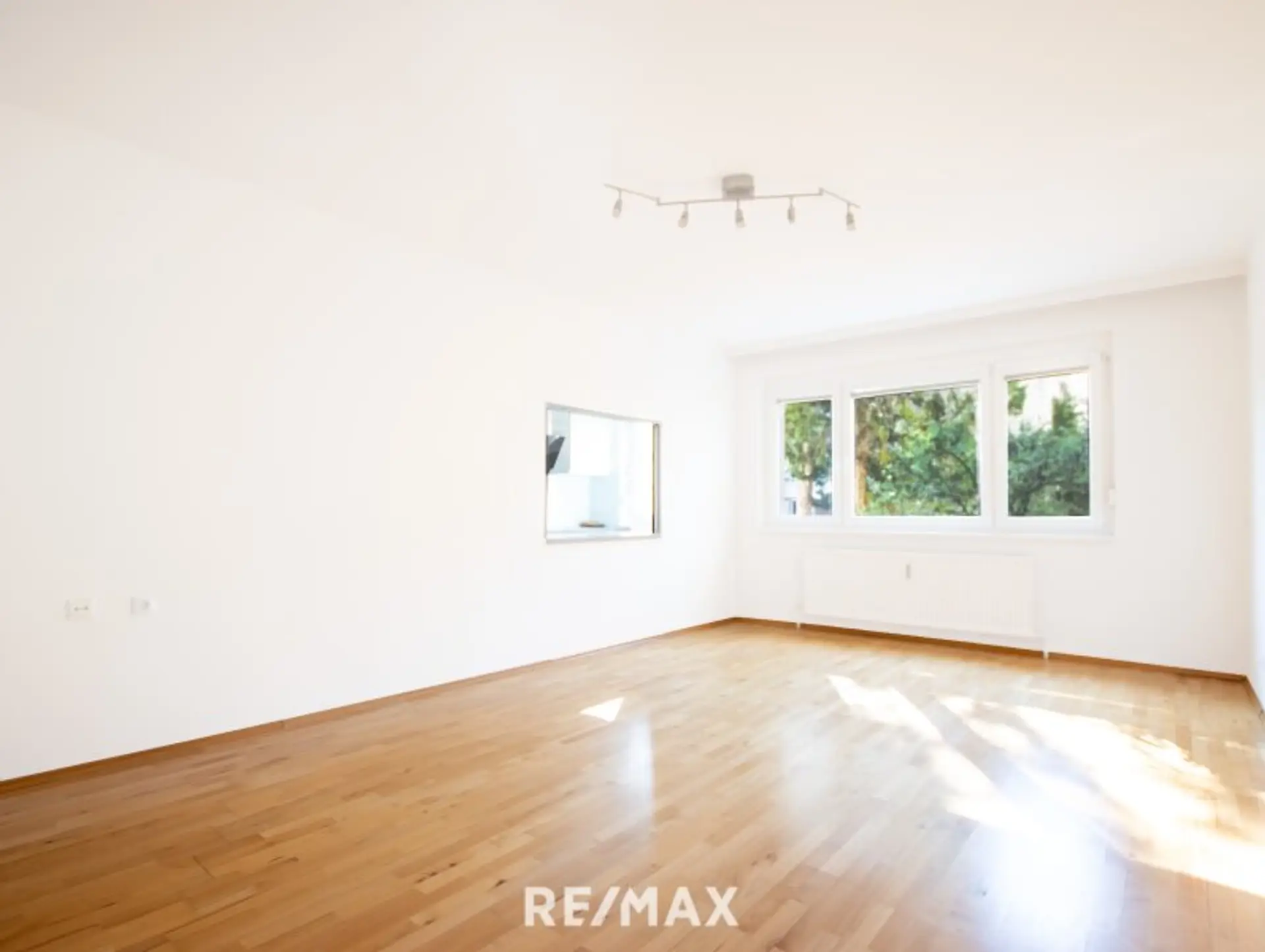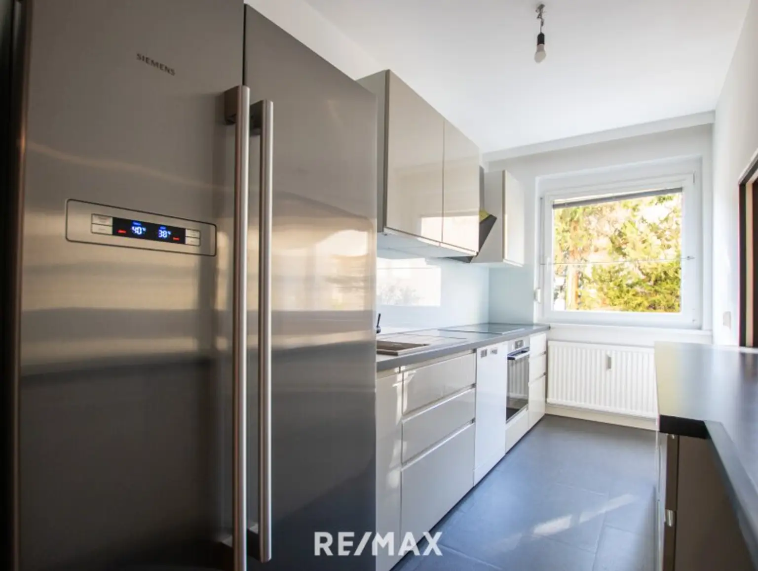 Das großzügige Wohn- Esszimmer bildet das Herzstück der Wohnung und besticht durch seine Helligkeit und angenehme Wohnqualität. Die beiden weiteren Zimmer- ein Schlafzimmer, sowie ein Kinderzimmer oder Büro, sind ruhig zur Rückseite der Anlage ausgerichtet und bieten einen schönen Blick ins Grüne. Die moderne, neuwertige Küche ist mit hochwertigen Markengeräten, sowie einem großen Kühlschrank ausgestattet und lässt keine Wünsche offen. Besonders praktisch und zugleich kommunikativ ist die Durchreiche ins Wohnzimmer, die den Alltag erleichtert und sich ideal beim Bewirten von Gästen eignet. Abgerundet wird das Raumangebot durch eine stilvoll gestaltete Garderobe mit ausreichend Stauraum. Die Wohnung wurde vor kurzem renoviert und ist sofort beziehbar. Neue Fenster sowie Sonnenschutzrollos sorgen zusätzlich für Komfort und ein angenehmes Wohnklima.