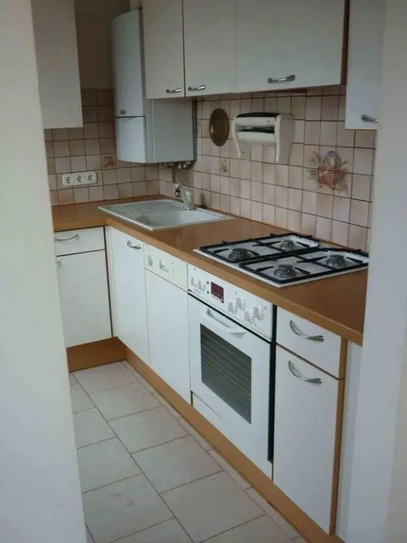 Komplette Einbauküche mit sämtlichen Geräten: Gasherd, Dunstabzug, Kühl-/Gefrierkombination, Mikrowelle, Geschirrspüler.