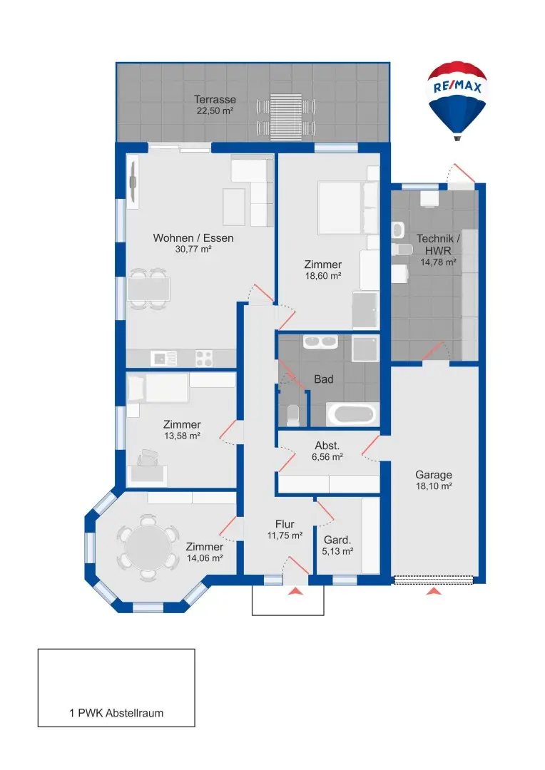 Das Haus verfügt über vier Zimmer, ein großes Badezimmer mit ebenerdiger Dusche und Badewanne, sowie ein separates WC mit Dusche im Schlafzimmer – für maximalen Komfort und Privatsphäre. Ergänzt wird das Raumangebot durch einen Abstellraum, einen Hauswirtschafts- und Technikbereich sowie eine Garage mit direktem Zugang ins Haus.