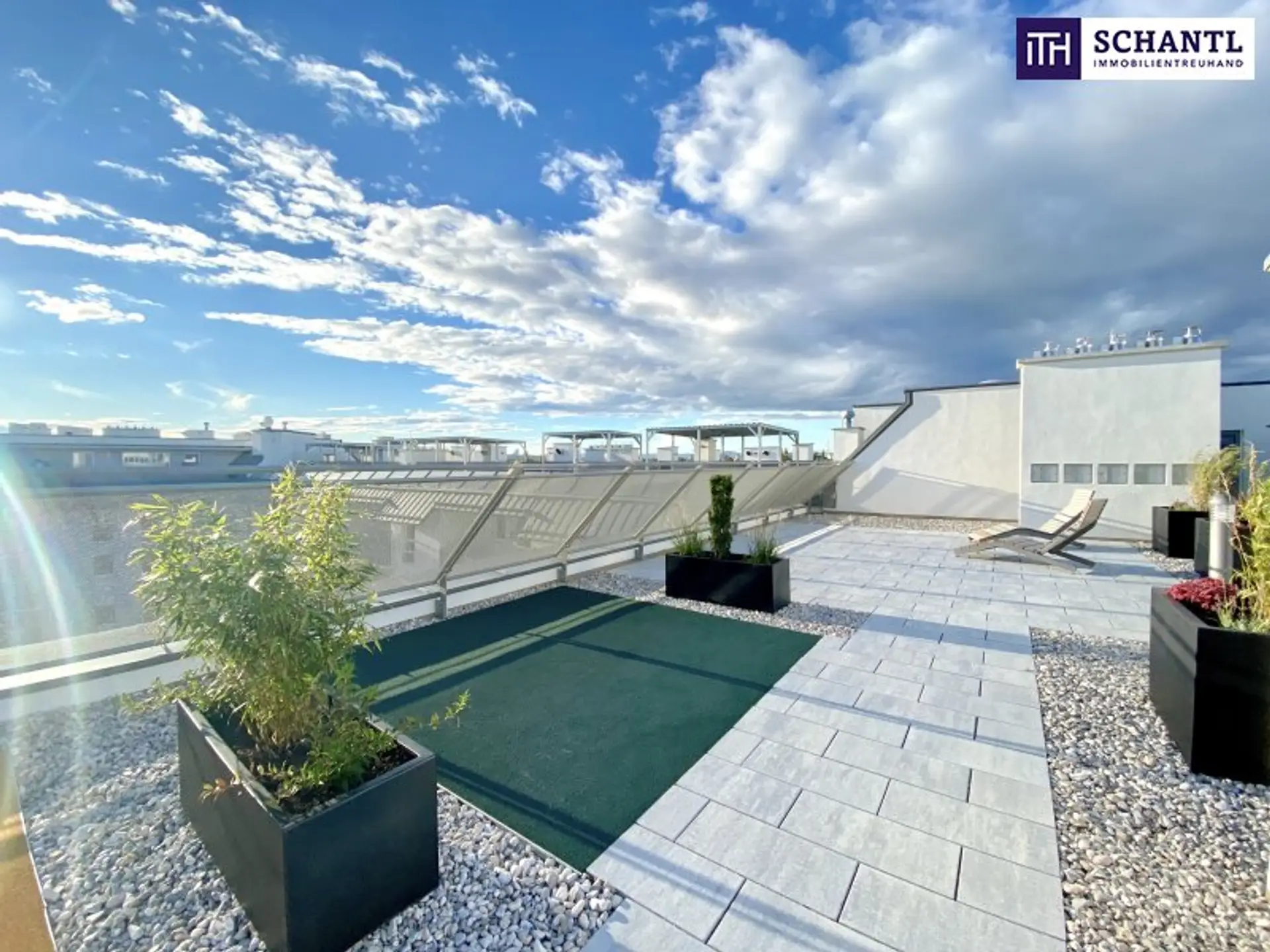 Highlight: Genießen Sie die große hauseigene Dachterrasse mit dem wunderbaren Fernblick, die den Mietern exklusiv zur Verfügung steht. Hier entspannen Sie in den Chillout-Bereichen, machen Sport auf den aufgestellten Fitnessgeräten, oder nutzen den integrierten Weichboden für Yoga.
