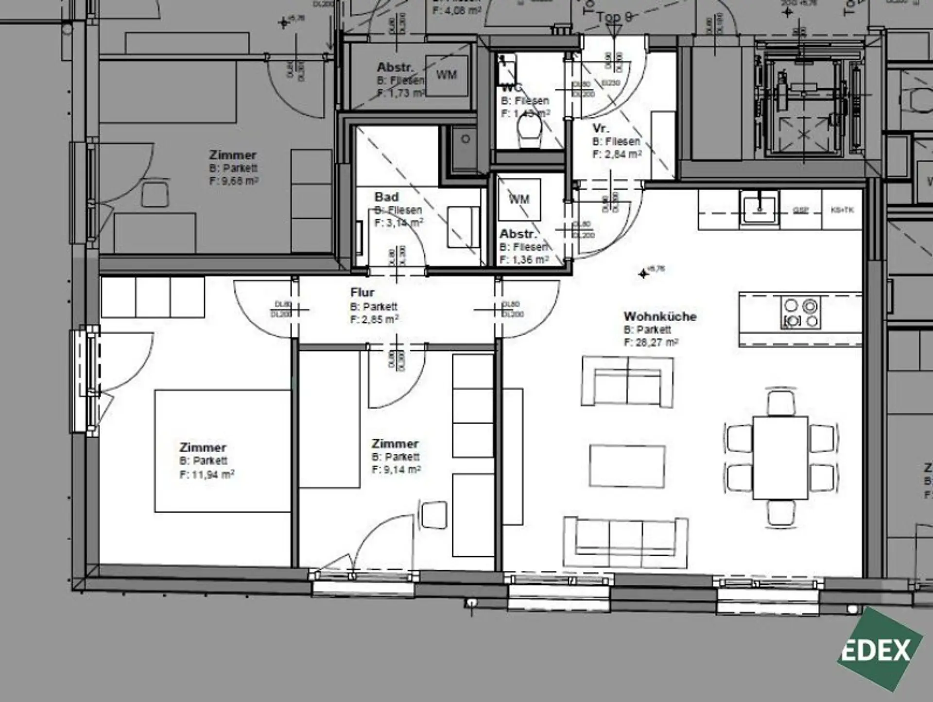 Die Wohnungen mit einer Größe von ca. 55 m² bis 85 m² verfügen über drei Zimmer und bieten großzügige Grundrisse mit durchdachter Raumaufteilung. Beinahe jede Einheit verfügt über eine Freifläche in Form von Balkon oder Terrasse – für mehr Licht, Luft und Lebensqualität. Die intelligente Raumnutzung vermittelt selbst bei kleineren Flächen Großzügigkeit. Der zentrale Wohnbereich mit offener Küche (ausgestattet mit modernen SIEMENS-Geräten) schafft einen harmonischen Mittelpunkt für entspanntes Wohnen.