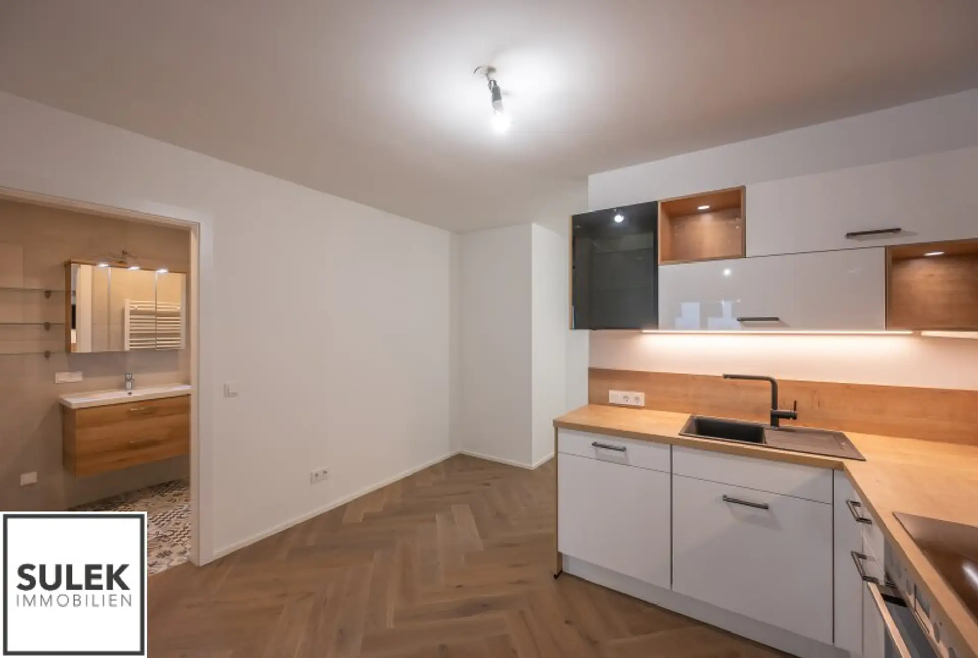 Die gegenständliche Wohnung liegt im 4. Liftstock des zugebauten Teils und blickt in den wunderschönen Hoftrakt, welcher mit Naturstein ausgeführt wurde. Die durchdachte Raumaufteilung bietet auf insgesamt rd. 46 m² Wohnfläche alles was das Herz begehrt. Über den Vorraum mit ausreichend Platz für eine Garderobe erreichen Sie stirnseitig den offen gestalteten Wohn- und Essbereich mit einer modernen Einbauküche. Das Schlafzimmer, sowie das Badezimmer befinden sich im rechten Teil der Wohnung. Das dezente in naturfarben gehaltene Badezimmer ist mit einem Waschplatz, Spiegelschrank, Unterbauschrank, Walk In Dusche, einem Waschmaschinen Anschluss und einem WC ausgestattet. Der Balkon ist vom Wohnzimmer aus zu erreichen.