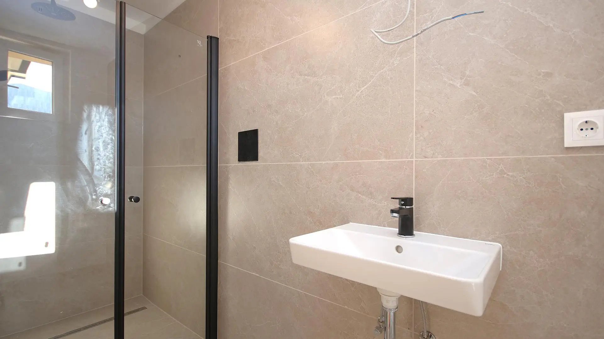 Das neu sanierte Badezimmer ist modern und hochwertig ausgeführt. Großformatige Fliesen, eine elegante Dusche und ein stilvolles Waschbecken sorgen für ein harmonisches Gesamtbild.