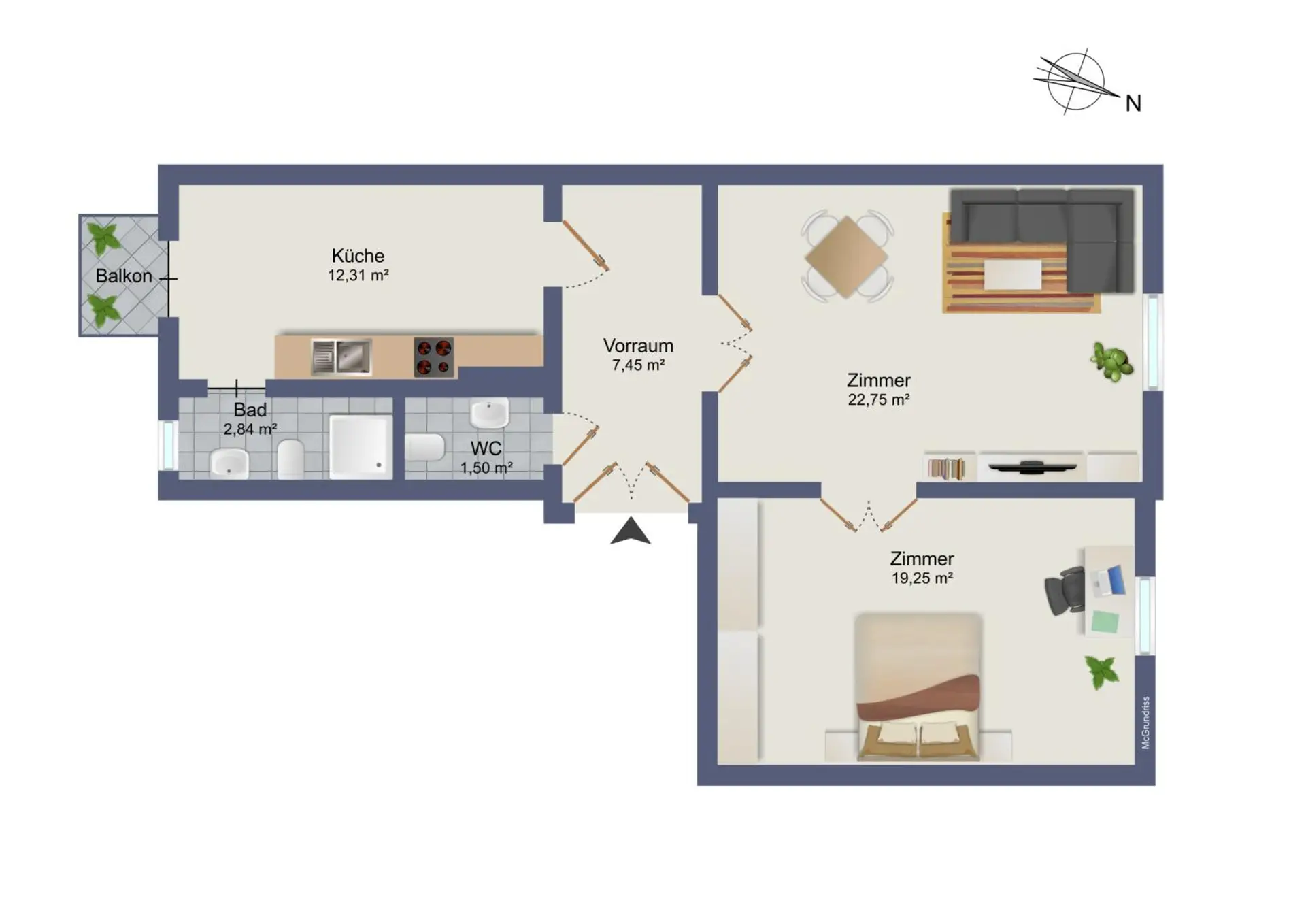 Der zentral gelegene Vorraum bietet Platz für Garderobe und Stauraum und verbindet die Räume übersichtlich miteinander.