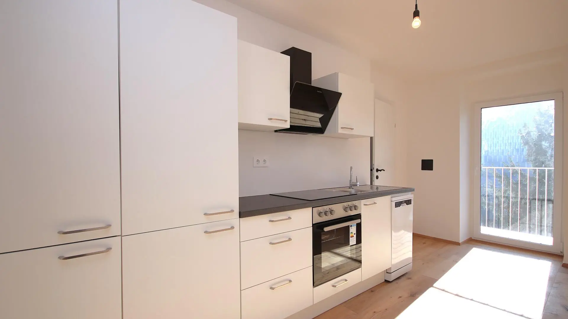 Die neue, modern ausgestattete Küche überzeugt durch zeitloses Design und Funktionalität. Von hier aus gelangt man direkt auf den neu sanierten südlich ausgerichteten Balkon, der den Wohnraum ins Freie erweitert und einen angenehmen Platz für entspannte Momente bietet.