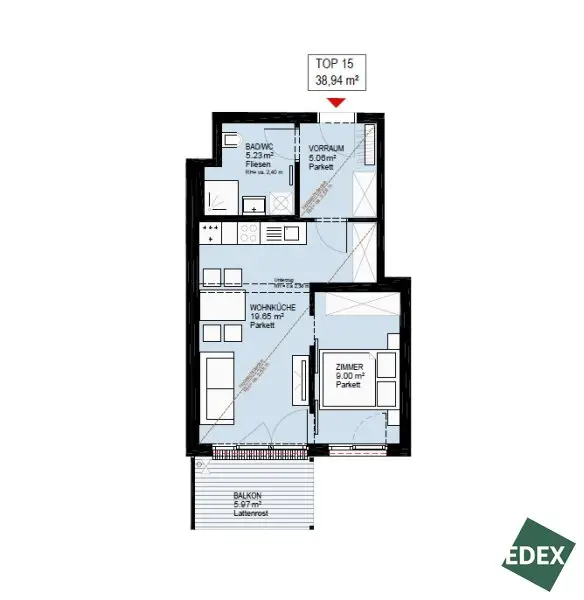 Die helle Wohnung verfügt über einen Vorraum, einen Wohnbereich und ein durch Schiebewände getrenntes Schlafzimmer, ein modernes Badezimmer mit Dusche, WC und Waschmaschinenanschluss, sowie über einen Balkon.