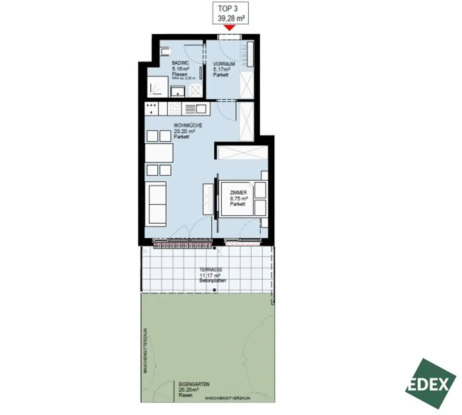 Die helle Wohnung verfügt über einen Vorraum, einen Wohnbereich und ein durch Schiebewände getrenntes Schlafzimmer, ein modernes Badezimmer mit Dusche, WC und Waschmaschinenanschluss, sowie über eine Terrasse und einen großzügigen Garten.