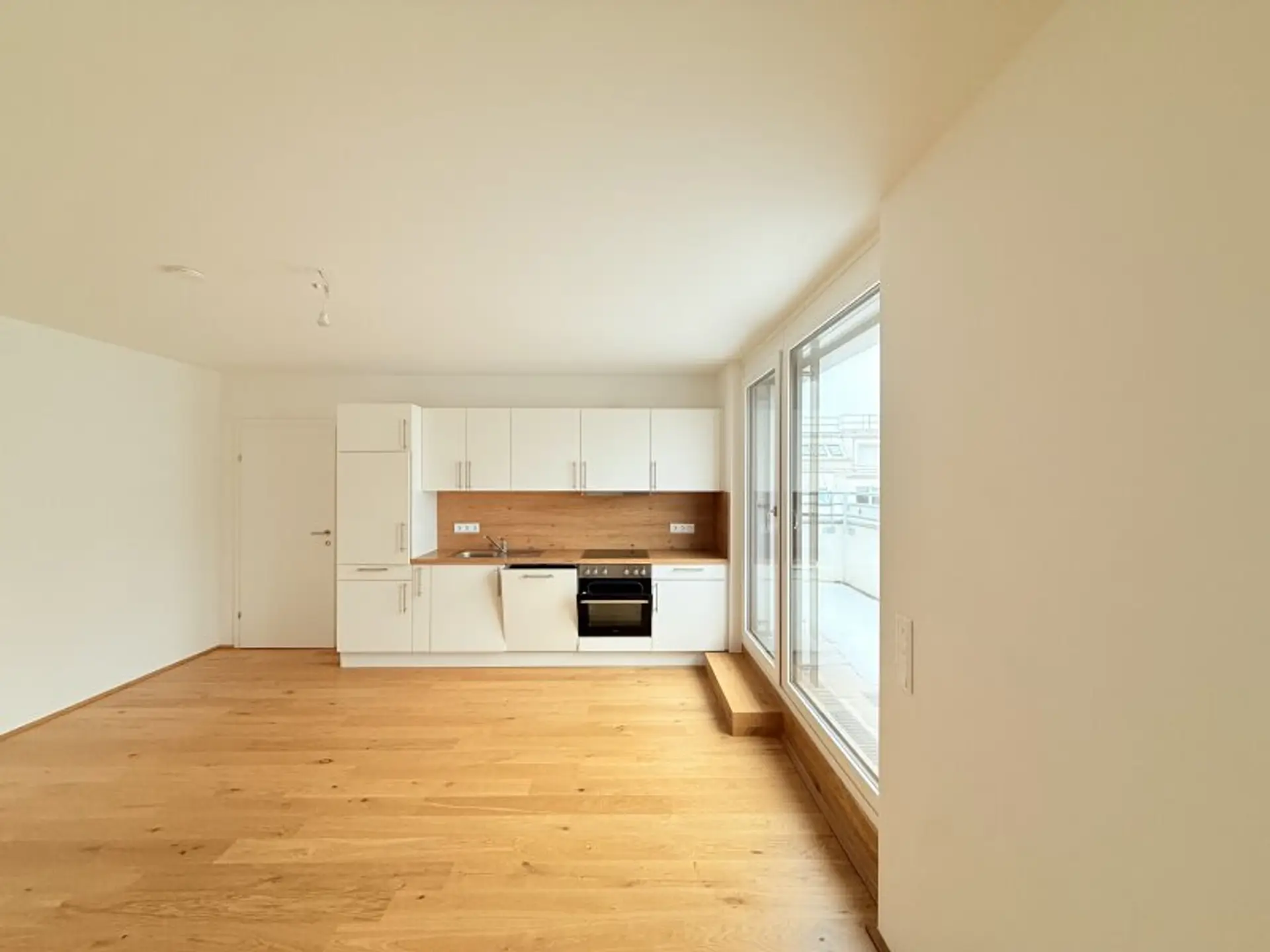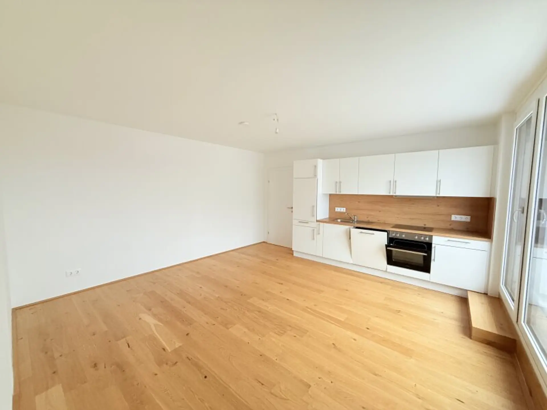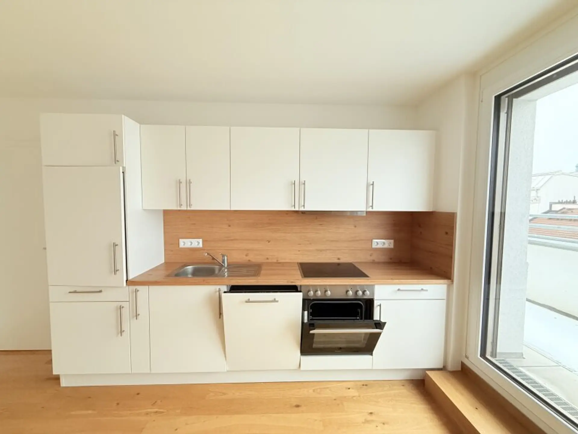 Der Küchenbereich ist mit einer modernen Hochglanz - Einbauküche ausgestattet inklusive sämtlicher Geräte (Spüle, Geschirrspüler, Cerankochfeld, Backrohr).