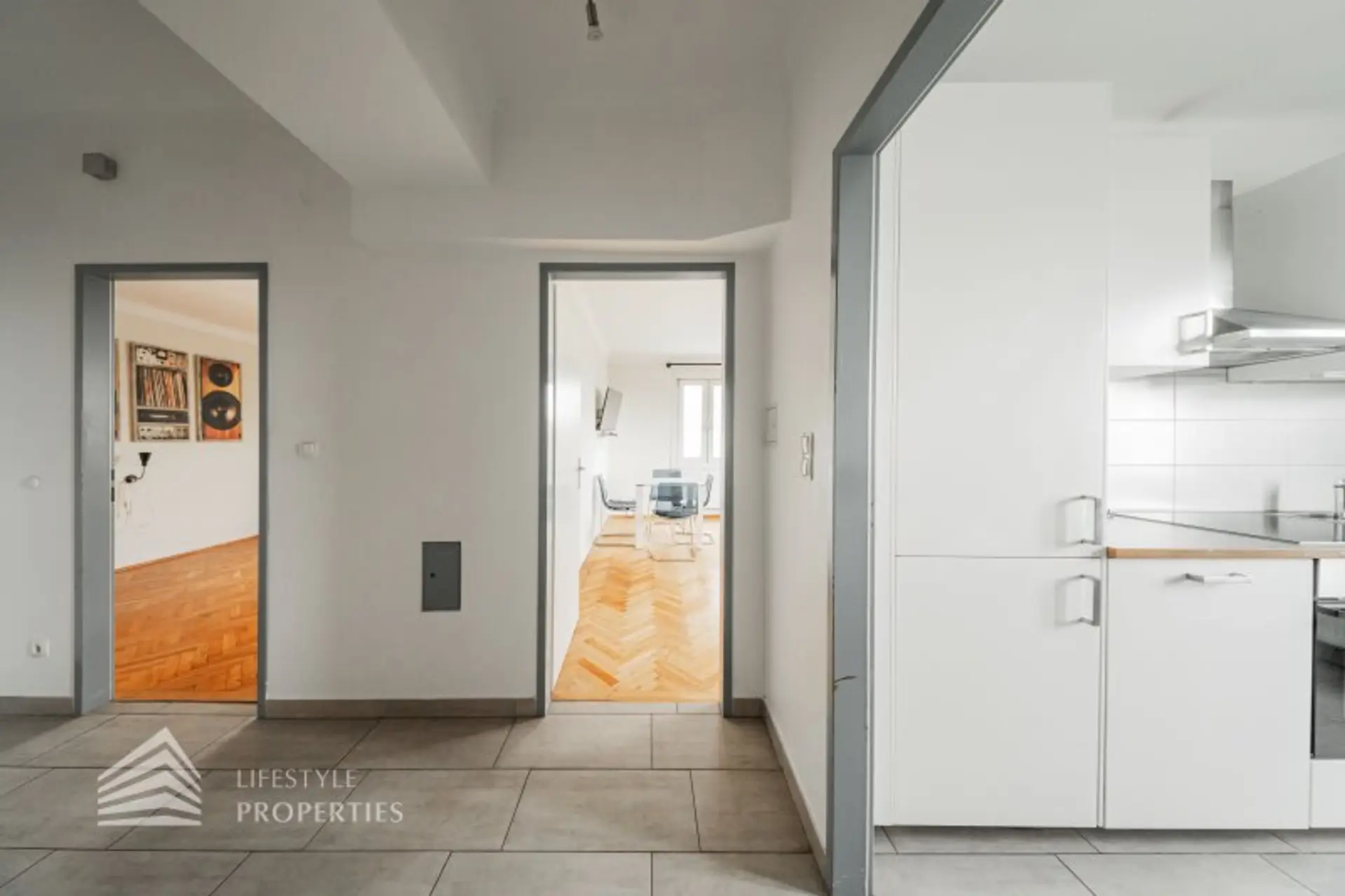Sie betreten die Wohnung und befinden sich im Vorraum. Gerade durch gelangen Sie in die getrennt von einander begehbaren Zimmer. Gegenüber von der Eingangstüre befindet sich die Küche, die auch Platz für einen Tisch bietet. Das Badezimmer verfügt über ein Fenster und ist mit einer Dusche, einem Waschbecken, einem Waschmaschinenanschluss und einem Handtuchtrockner ausgestattet.