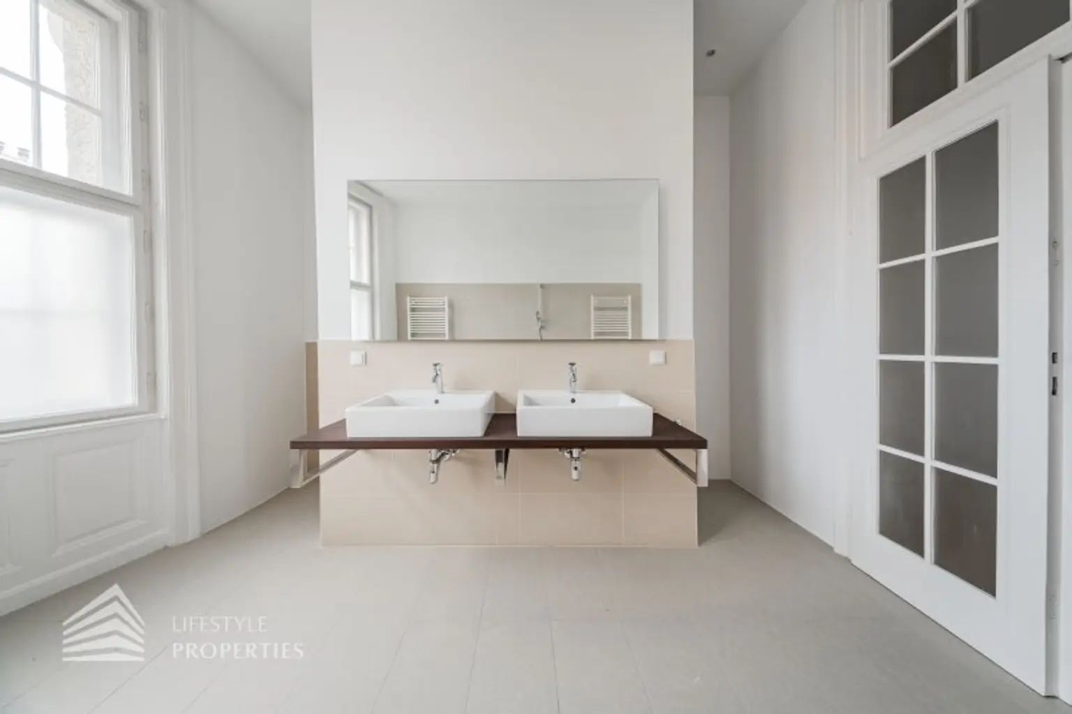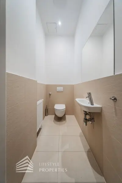 Sie betreten die Wohnung und befinden sich im Vorraum, gerade durch gelangen Sie in den großen Salon, der genug Platz für eine gemütliche Sitzecke und einen Esstisch bietet. Vom Entrée links in den Flur befindet sich linkerhand die komplett ausgestattete, neue Küche mit Fenster. Rechts gelangen Sie in eines der Zimmer mit en-suite Badezimmer, welches mit einer Dusche und einem Waschbecken ausgestattet ist. Im Flur weiter gerade durch gelangen Sie in das zweite und sehr geräumige Zimmer mit en-suite Badezimmer. Dieses ist mit einer Badewanne, einer Dusche, einem Doppelwaschbecken, einem Handtuchtrockner und einem WC ausgestattet. Zwischen Zimmer und Bad befindet sich ein Raum, der sich perfekt als Schrankraum eignen würde. Der Abstellraum ist mit einem Waschmaschinenanschluss ausgestattet und befindet sich so wie die separate Toilette im Vorraum.