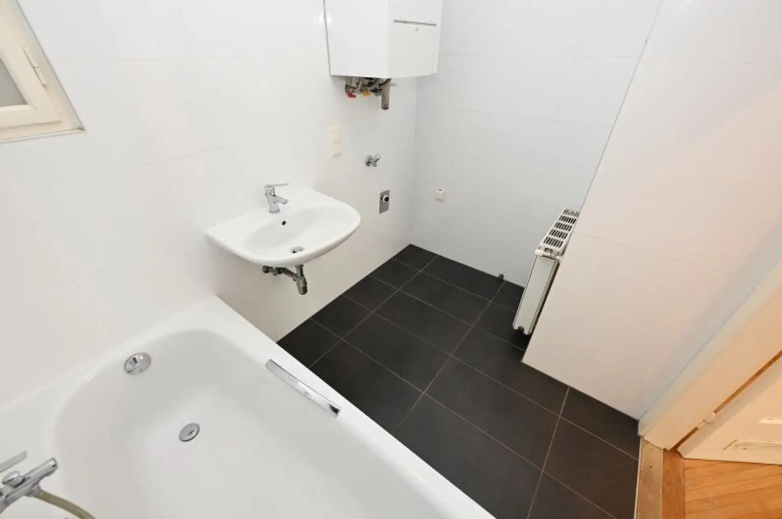 * Bad mit Wanne, Waschbecken und Waschmaschinenanschluss