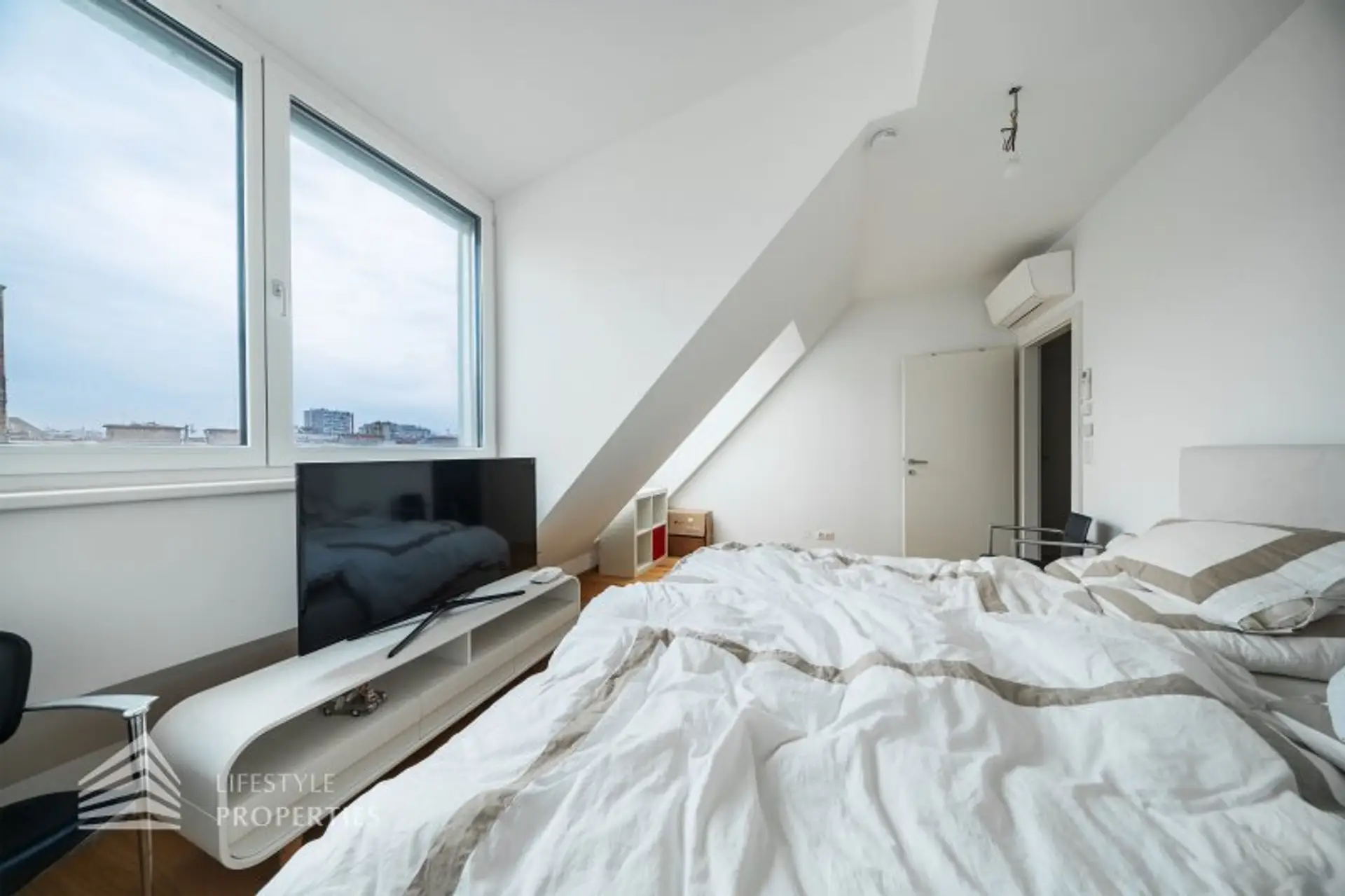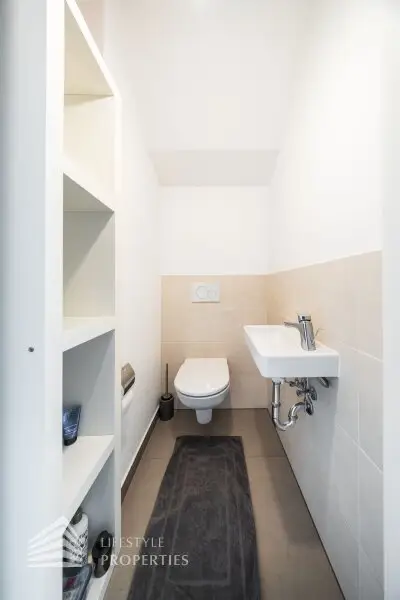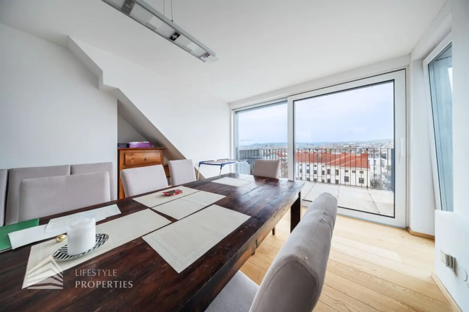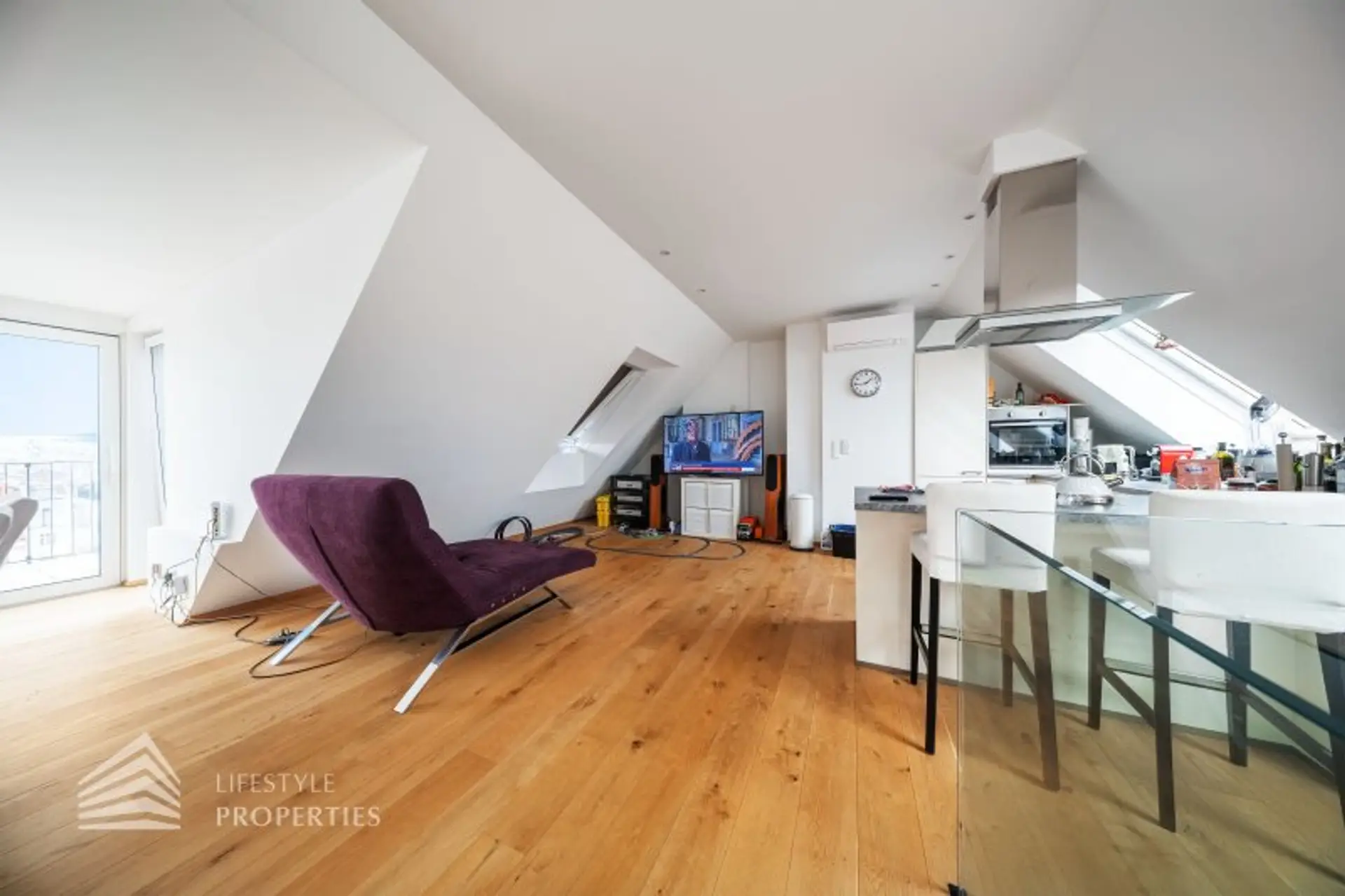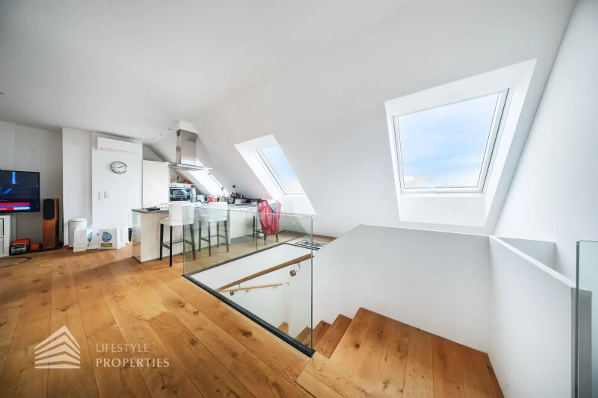 Die Wohnung befindet sich im DG eines im Jahre 1971 erbauten Neubaus und erstreckt sich über eine Wohnfläche von ca. 94 m² und ca. 7 m² privater Terrasse mit einem traumhaften Blick über Wien. Die moderne Immobilie erstreckt sich auf zwei Ebenen. Die Wände der Wohnräume, alle Türen und Fenster sind in zeitlosen Weiß gehalten.