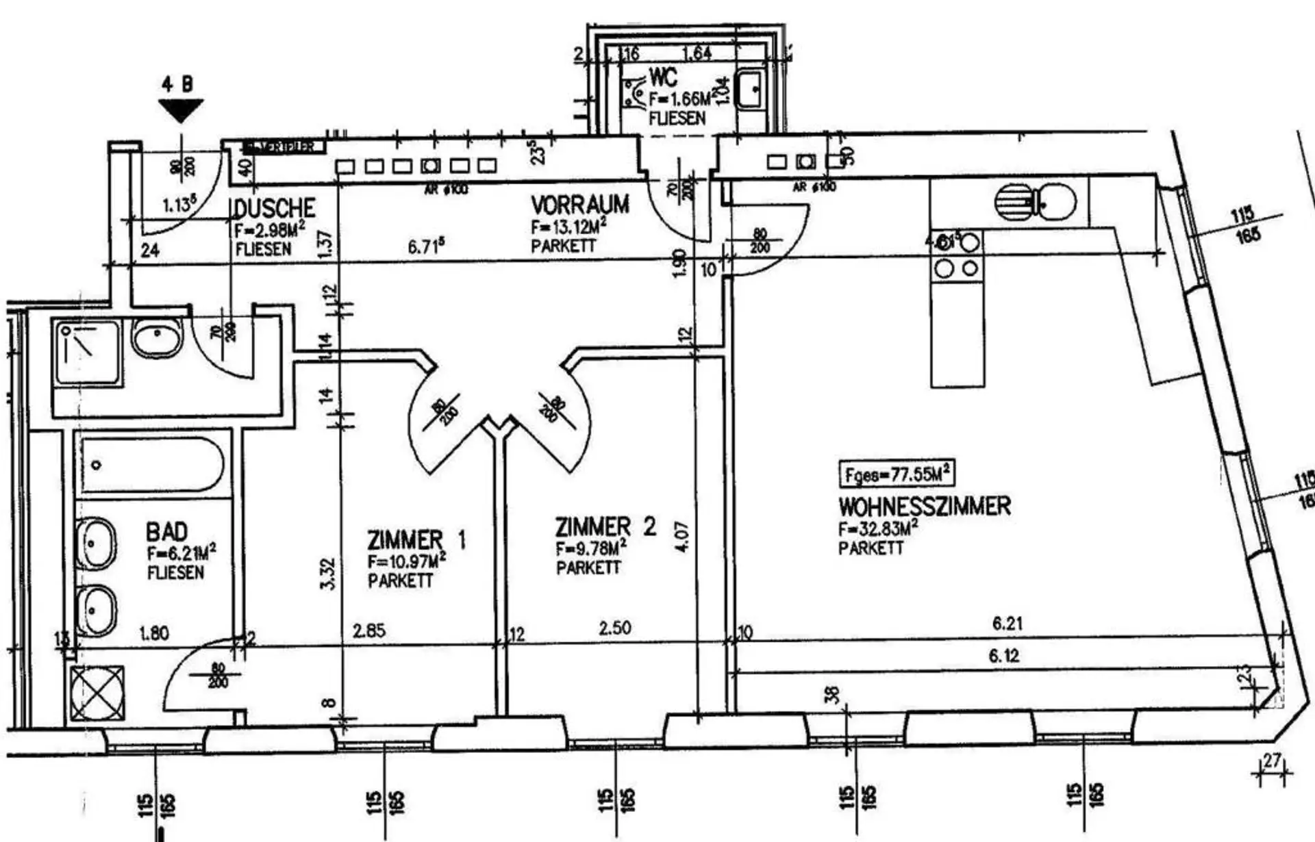 Die Wohnung verfügt über ca. 78 m² Wohnnutzfläche die sich wie folgt aufteilen: ein großes Vorzimmer, eine separate Toilette (mit Handwaschbecken und Spiegel), ein kleines Badezimmer (mit Dusche, Waschbecken und Spiegel mit Licht), ein großes Badezimmer (mit Badewanne samt Duscharmaturen, Waschmaschinenanschluß und Doppelwaschbecken), ein großes Wohn- Esszimmer mit eingerichteter Küche und 2 Schlafzimmer