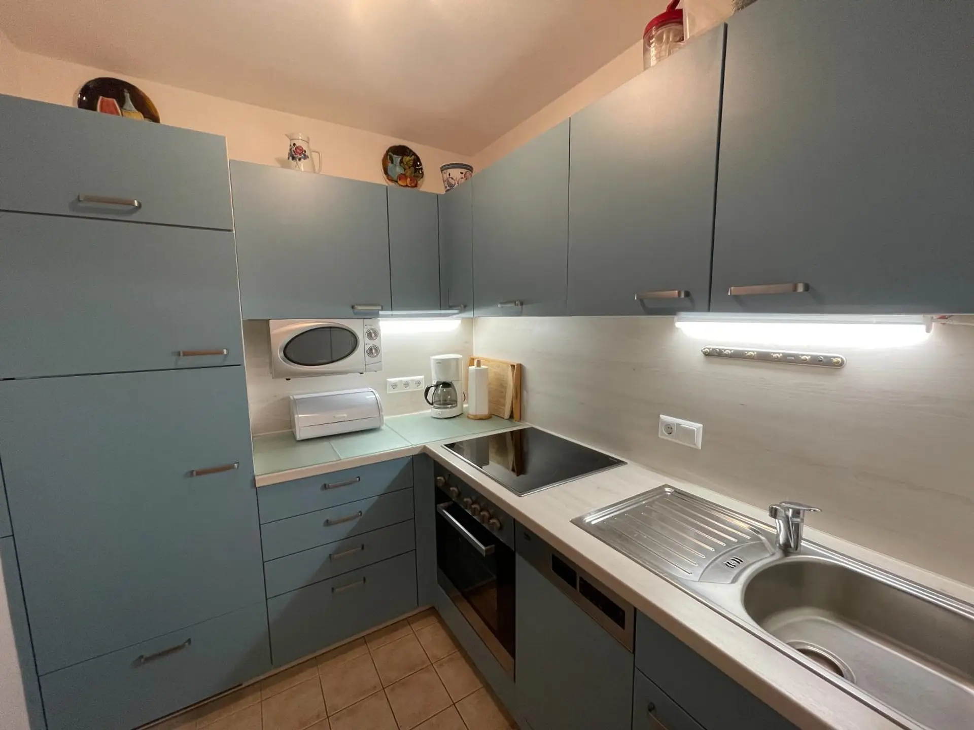 Die neuwertige, moderne Einbauküche liegt separat und ist ausgestattet mit Unterschrankbeleuchtung, Schubfächern mit Softeinzug, einem separaten Gefrierfach, Herd, Cerankochfeld und Dunstabzug. Die Wohnung ist an eine zentrale Lüftungsanlage angeschlossen. Die integrierte Spülmaschine wurde im September 2025 durch ein zeitgemäßes Gerät ersetzt.