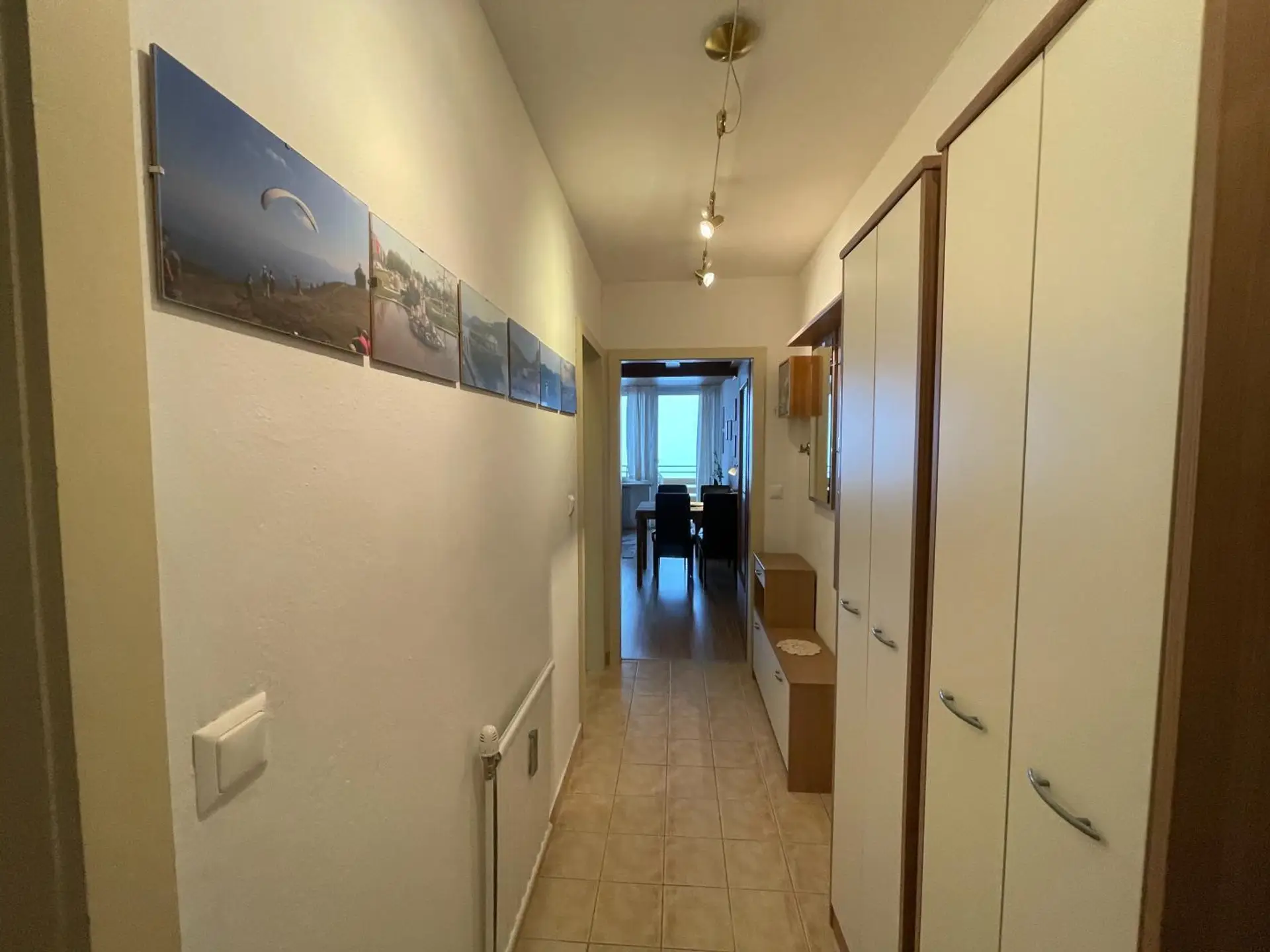 Der ca. 5 m² große Flur ist ausgestattet mit zwei Aufbewahrungsschränken, Garderobe samt Spiegel und Schuhschrank aus der gleichen Möbelserie.