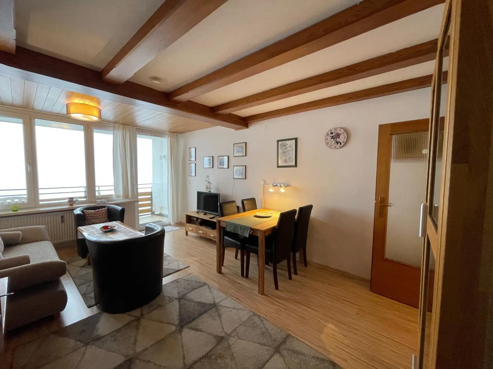 Der ca. 18 m² große Wohn-/Essbereich ist über die ganze Breite des Zimmers nach Süden hin verglast, mit direktem Zugang zur Loggia. Das Wohnzimmer ist ausgestattet mit einer Vitrine für Gläser, einem Einbauschrank und einer Schlafcouch mit gemütlicher Sitzecke, einem Smart-TV mit Kabelanschluss und einer neuen Minianlage mit DAB-Radio.