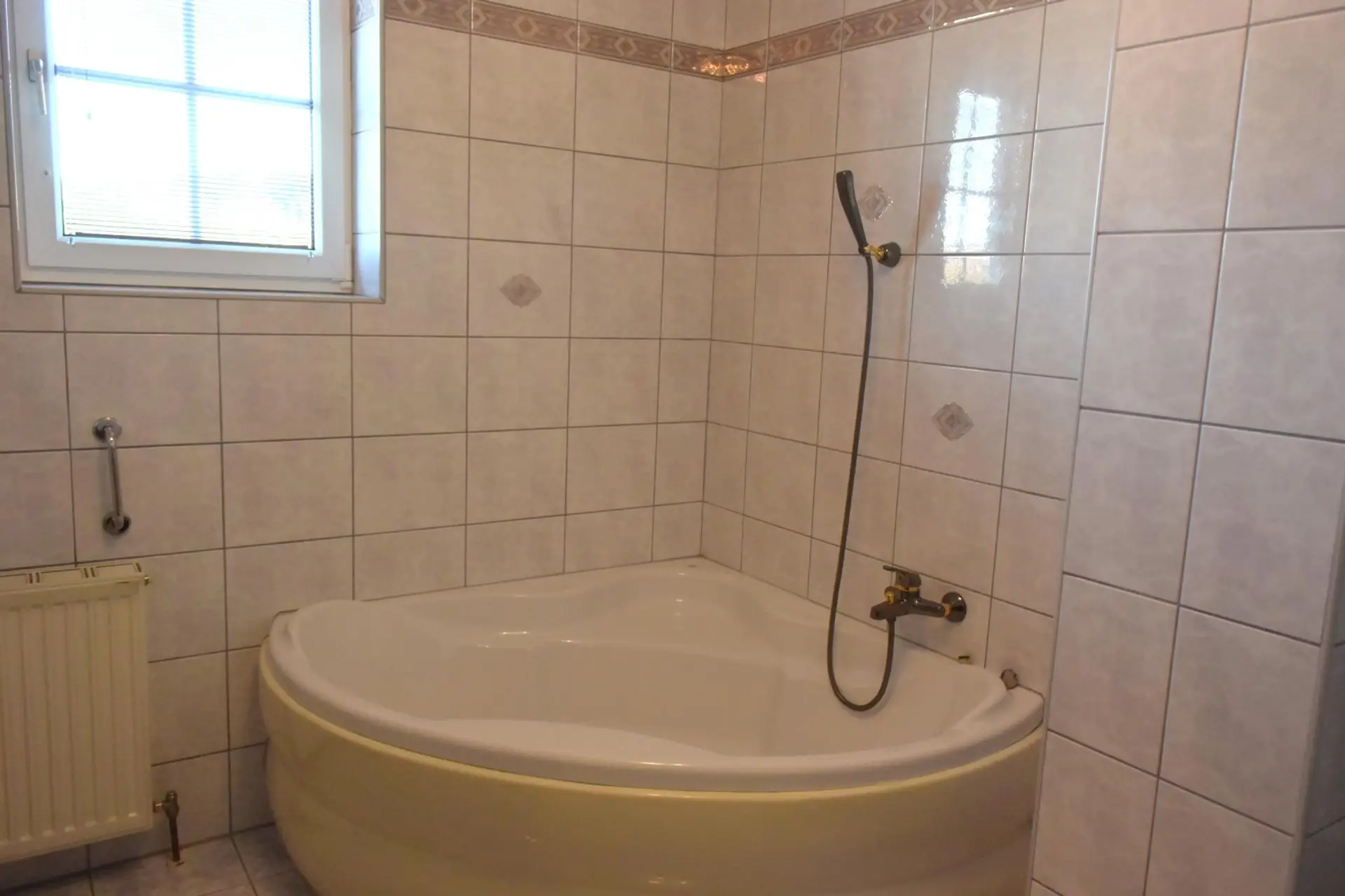 Vorraum, Küche, Wohn-Essbereich mit Kachelofen und Ausgang auf eine befestigte Terrasse mit Gartenzugang, 3 Zimmer, Bad, WC.