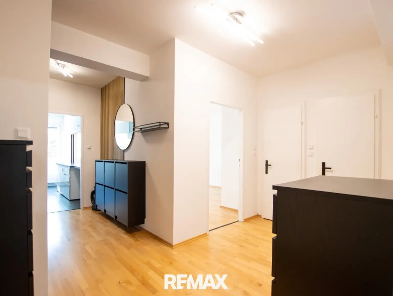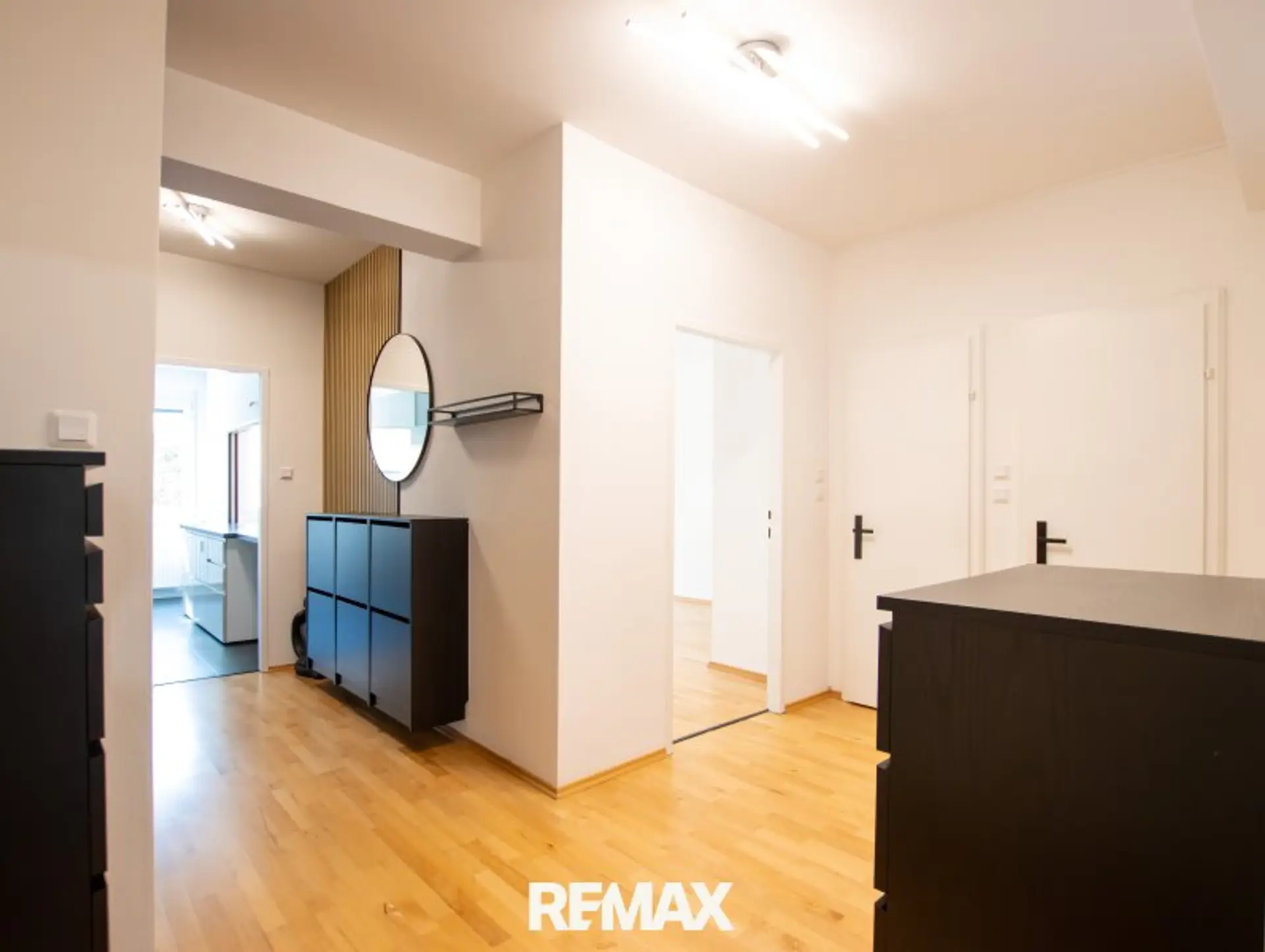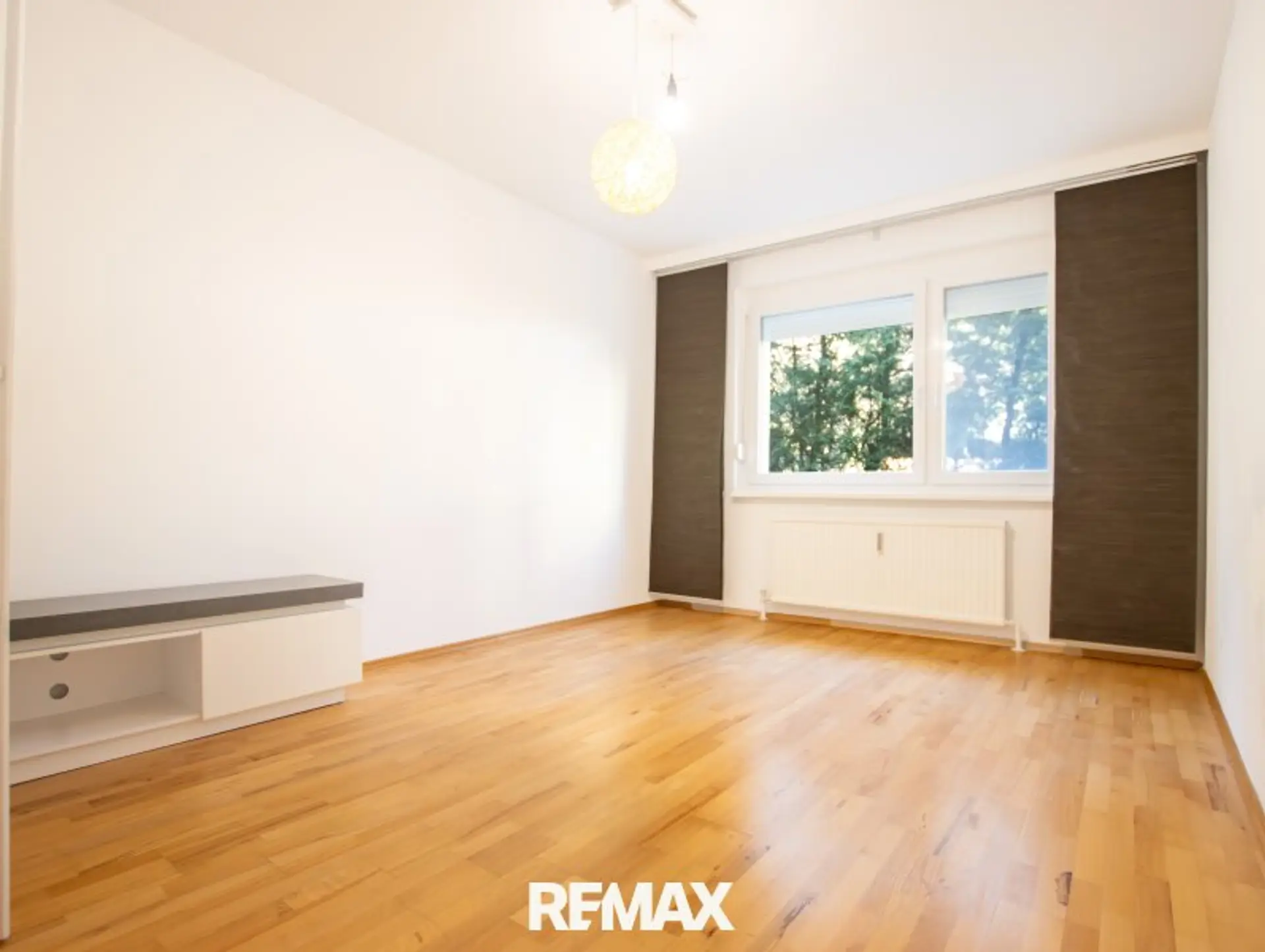 Das großzügige Wohn- Esszimmer bildet das Herzstück der Wohnung und besticht durch seine Helligkeit und angenehme Wohnqualität. Die beiden weiteren Zimmer- ein Schlafzimmer, sowie ein Kinderzimmer oder Büro, sind ruhig zur Rückseite der Anlage ausgerichtet und bieten einen schönen Blick ins Grüne. Die moderne, neuwertige Küche ist mit hochwertigen Markengeräten, sowie einem großen Kühlschrank ausgestattet und lässt keine Wünsche offen. Besonders praktisch und zugleich kommunikativ ist die Durchreiche ins Wohnzimmer, die den Alltag erleichtert und sich ideal beim Bewirten von Gästen eignet. Abgerundet wird das Raumangebot durch eine stilvoll gestaltete Garderobe mit ausreichend Stauraum. Die Wohnung wurde vor kurzem renoviert und ist sofort beziehbar. Neue Fenster sowie Sonnenschutzrollos sorgen zusätzlich für Komfort und ein angenehmes Wohnklima.