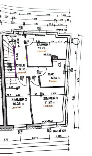 * Wohnfläche gesamt rund 95 m² - 3 Zimmer, Wohnküche, WC mit Handwaschbecken, Bad mit Dusche und WC, Vorraum
