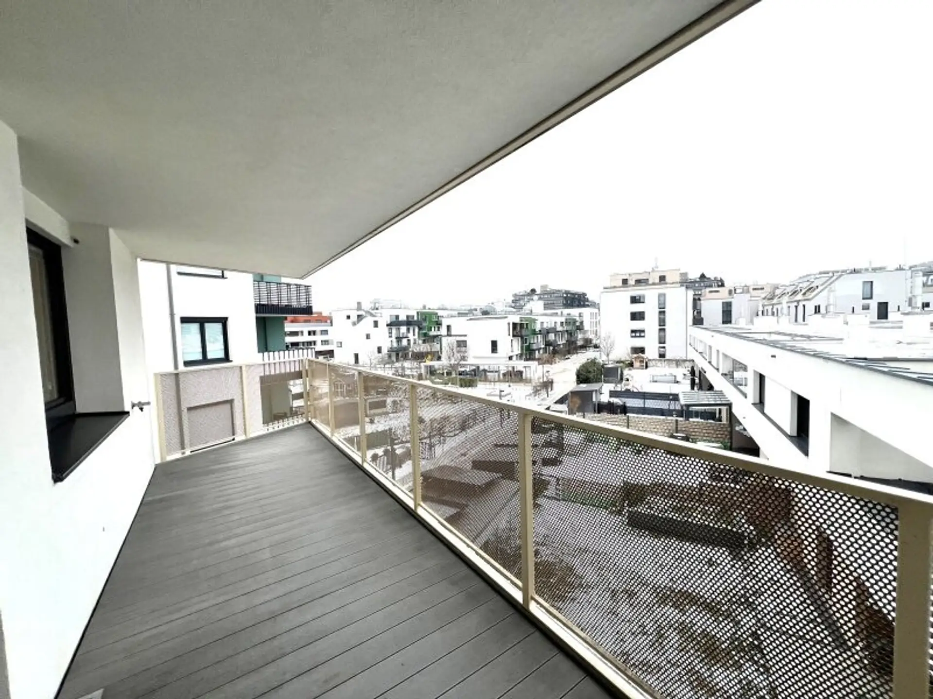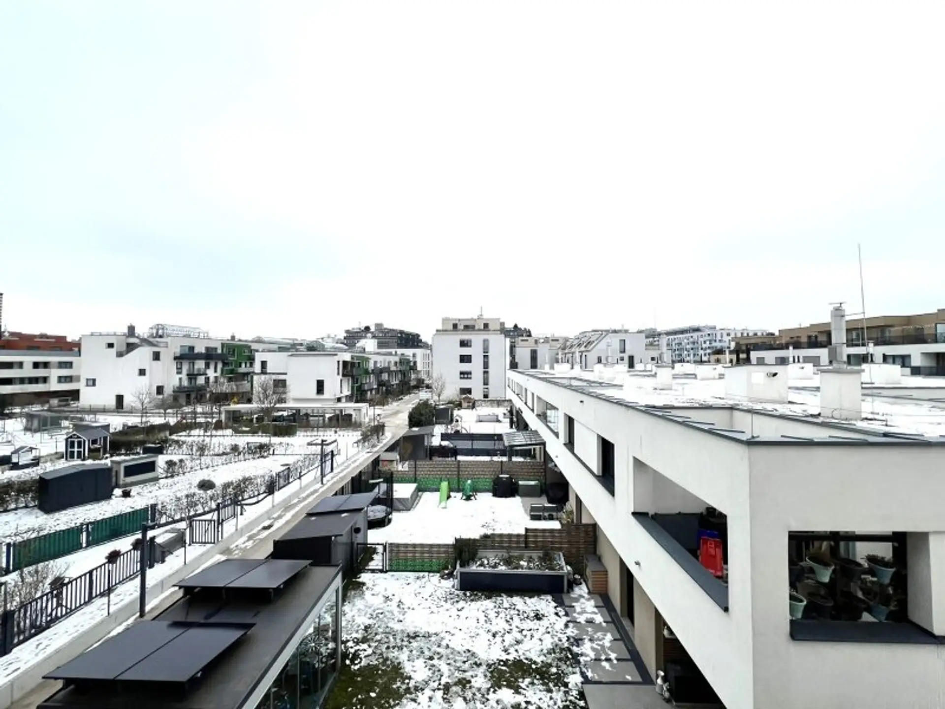Im Außenbereich der modernen Wohnhausanlage befindet sich ein Spielplatz.