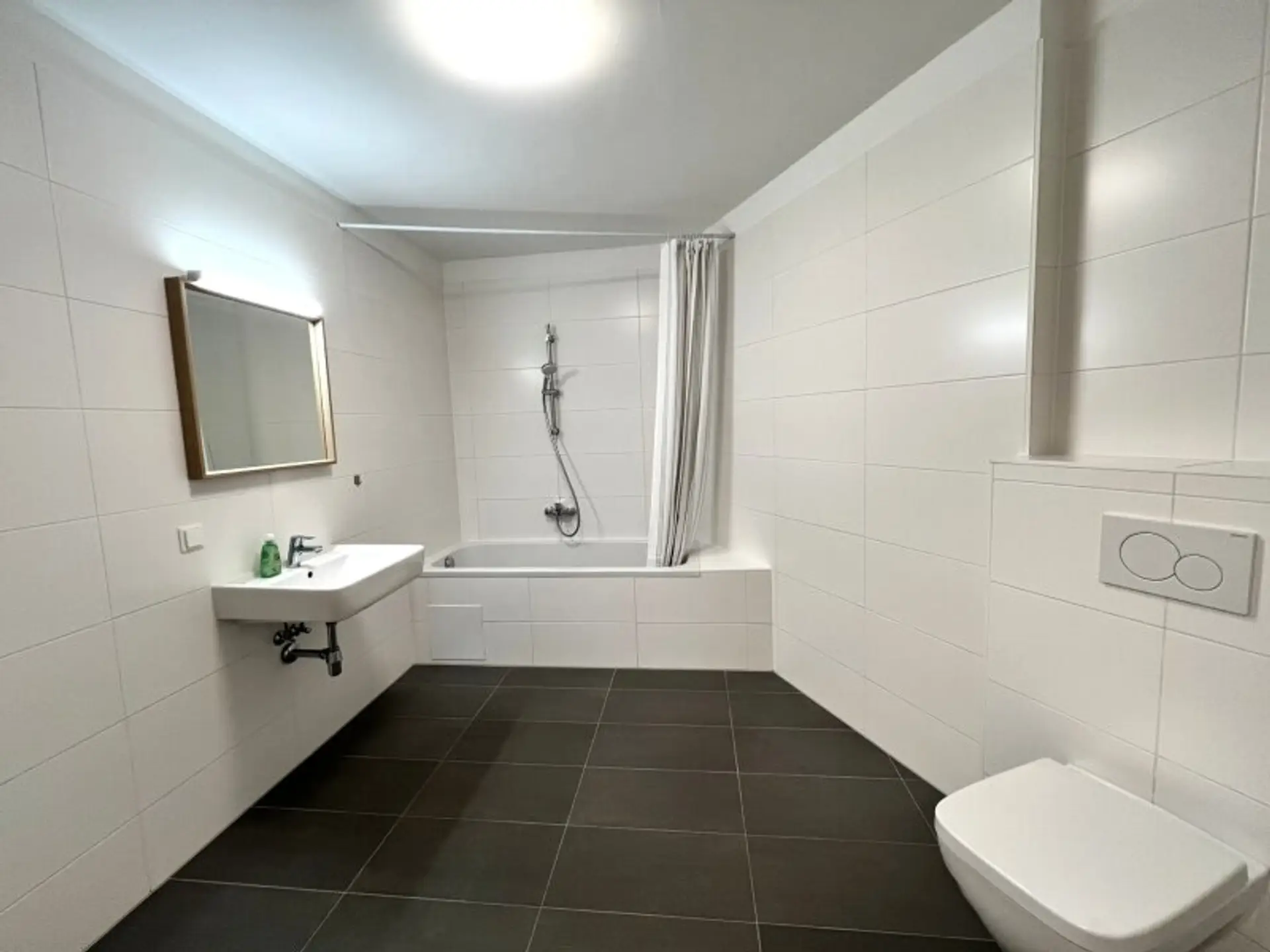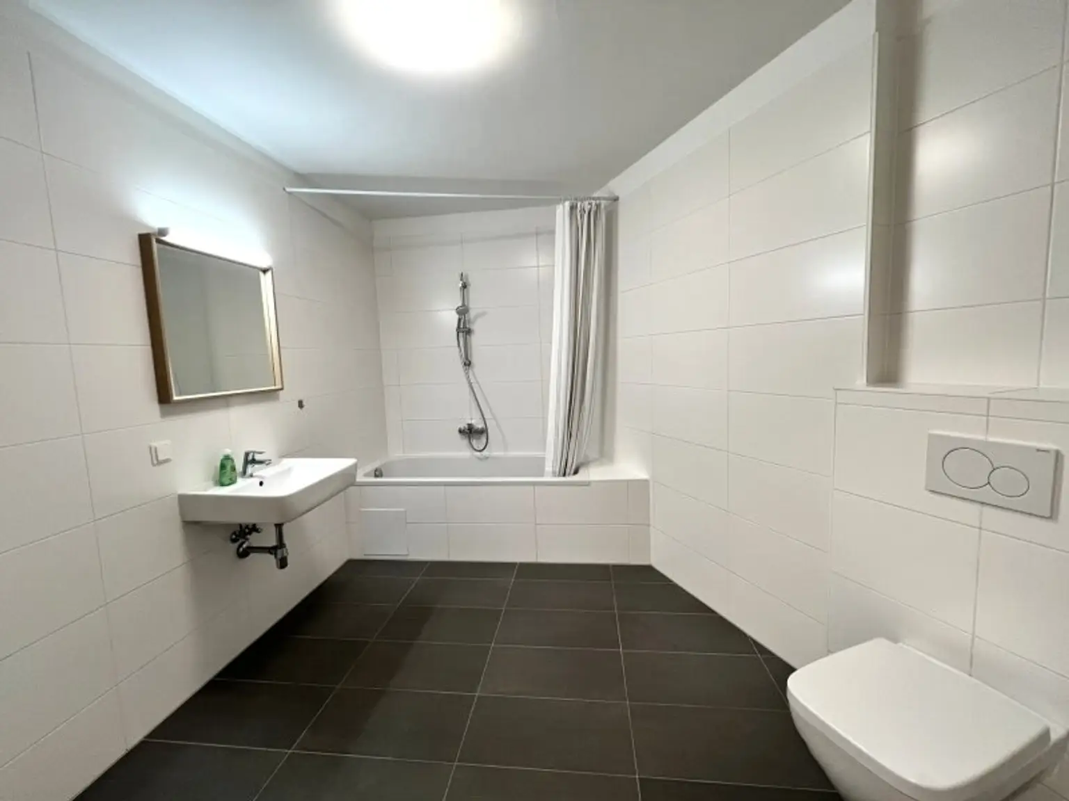 * Großes Badezimmer mit Waschtisch, Badewanne, WC und Waschmaschinenanschluss