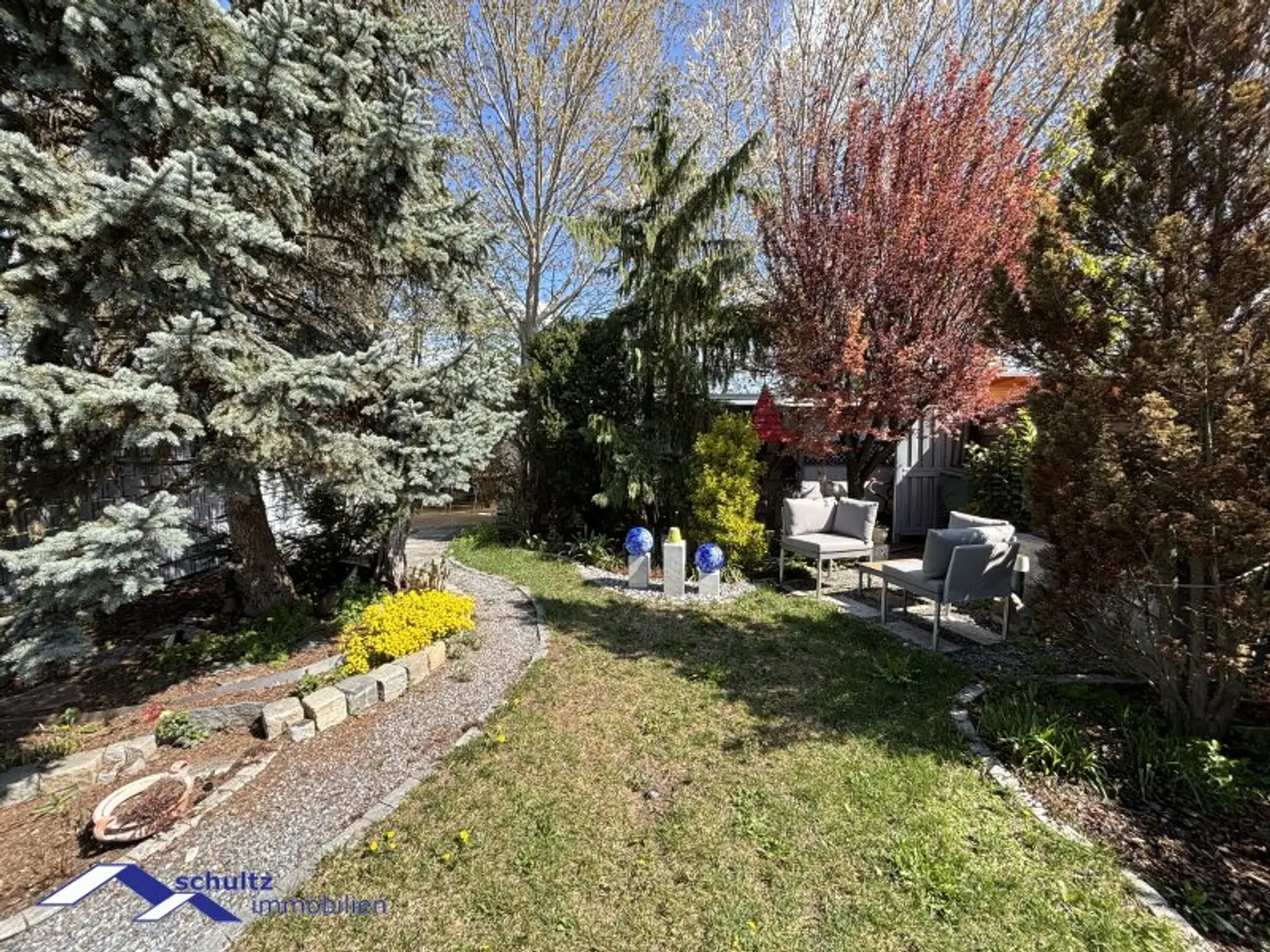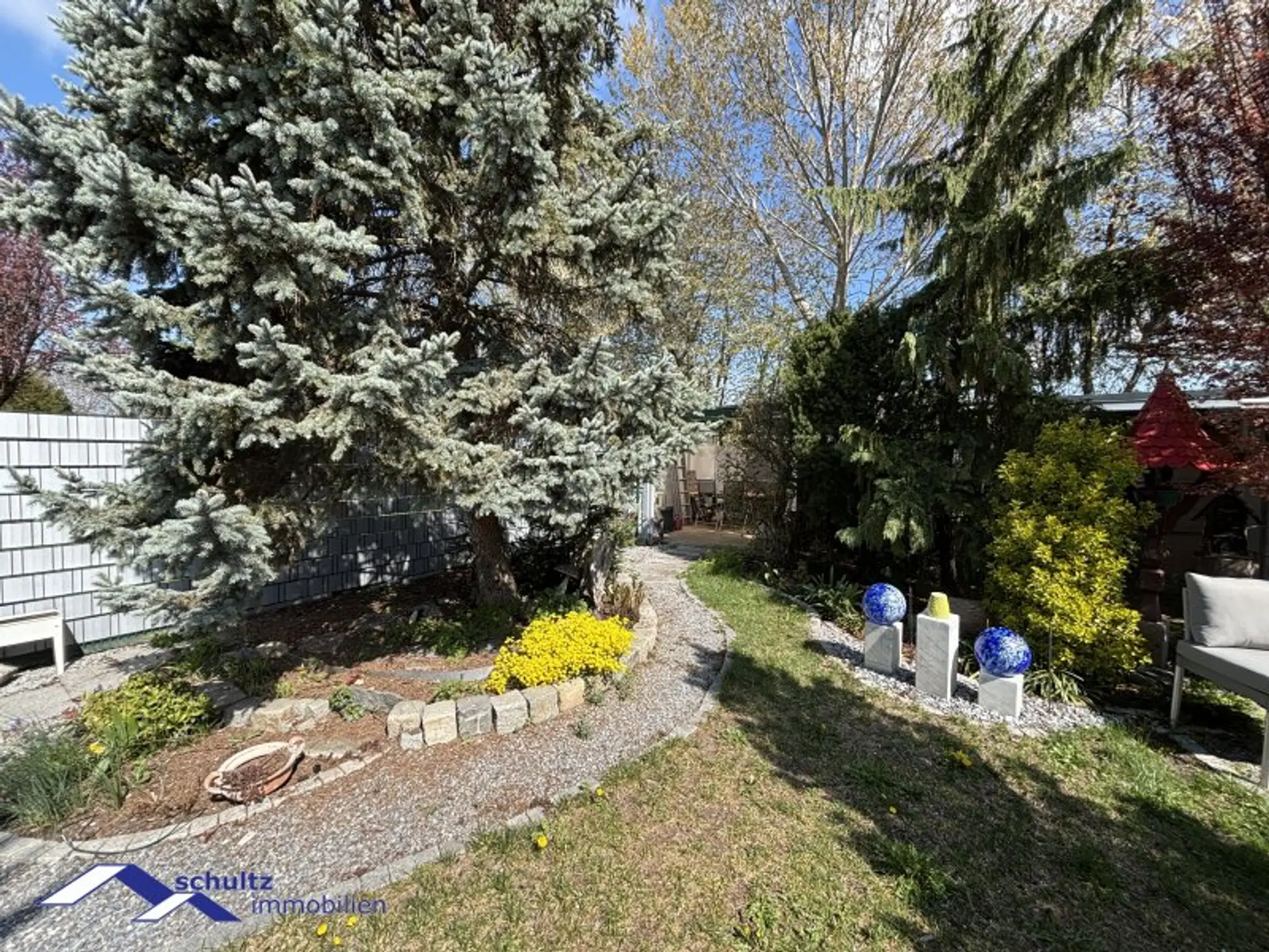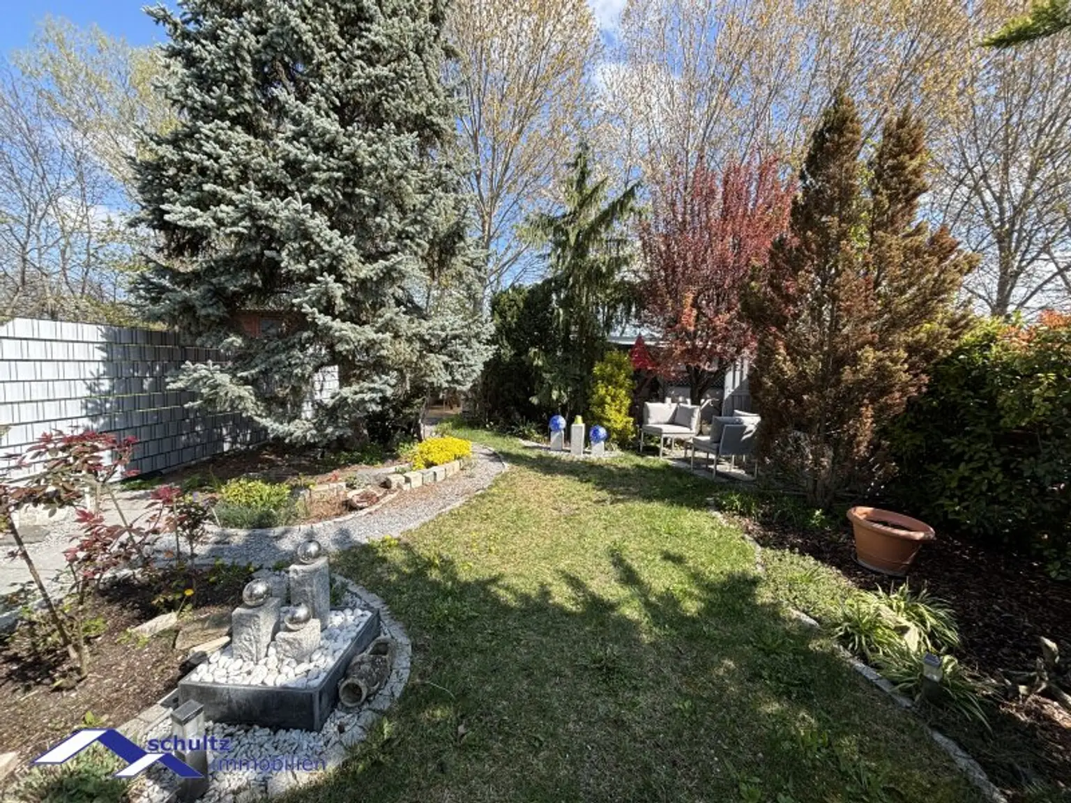 Der liebevoll gestaltete Garten präsentiert sich als wahre Wohlfühloase und lädt zum Entspannen und Verweilen ein.