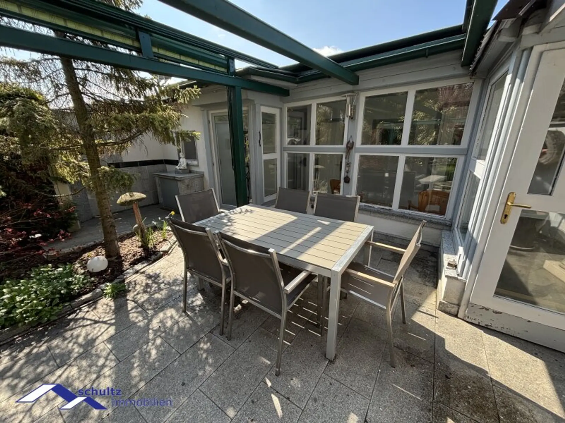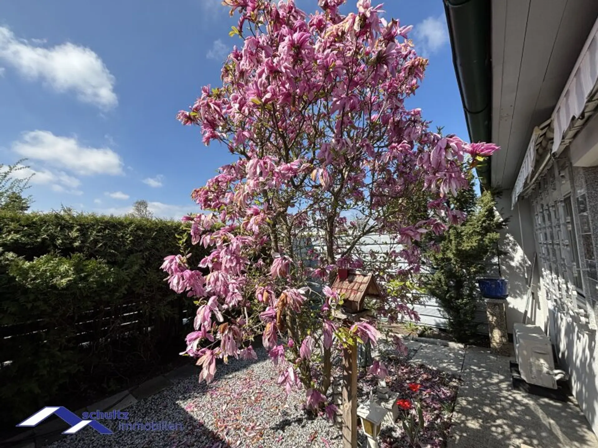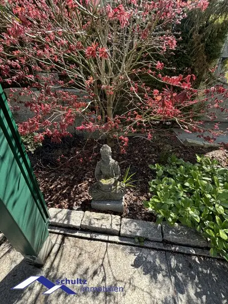 Der liebevoll gestaltete Garten präsentiert sich als wahre Wohlfühloase und lädt zum Entspannen und Verweilen ein.