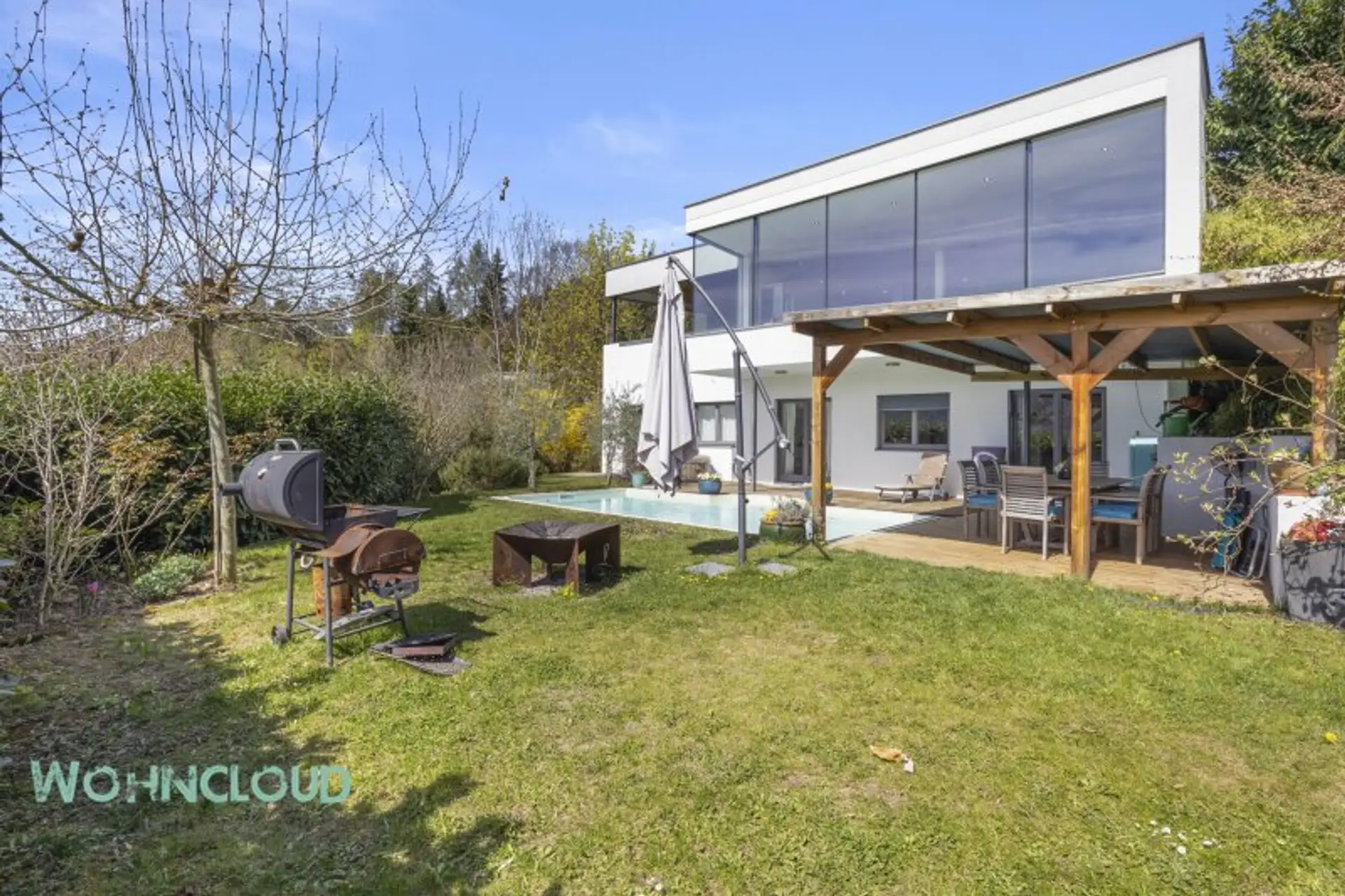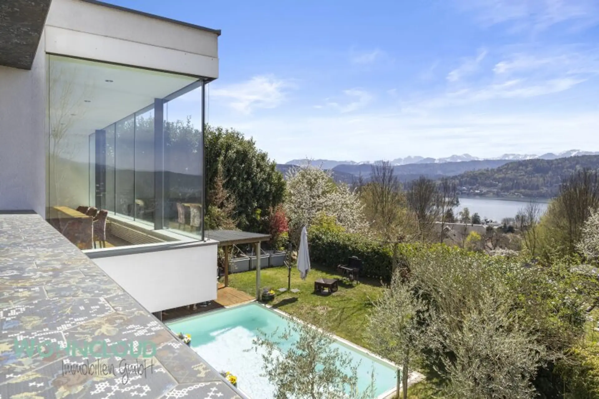 Der Garten mit Pool wird im Sommer zum Lebensmittelpunkt, Terrassen und Loggien schaffen Rückzugsorte zu jeder Tageszeit. Ob Frühstück in der Morgensonne oder ein Glas Wein mit Blick auf den Sonnenuntergang am See oder den Bergen – hier wird jeder Moment besonders.