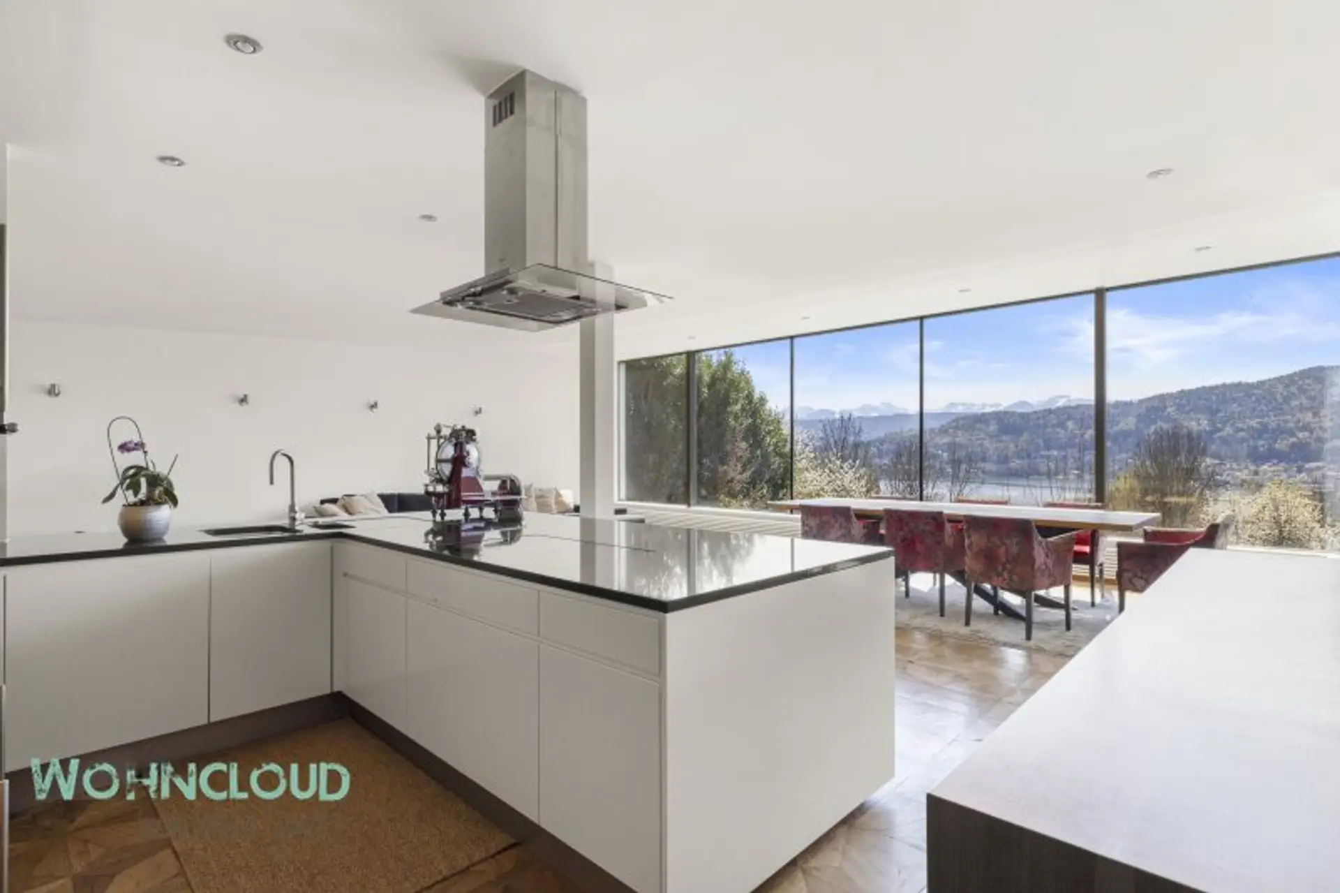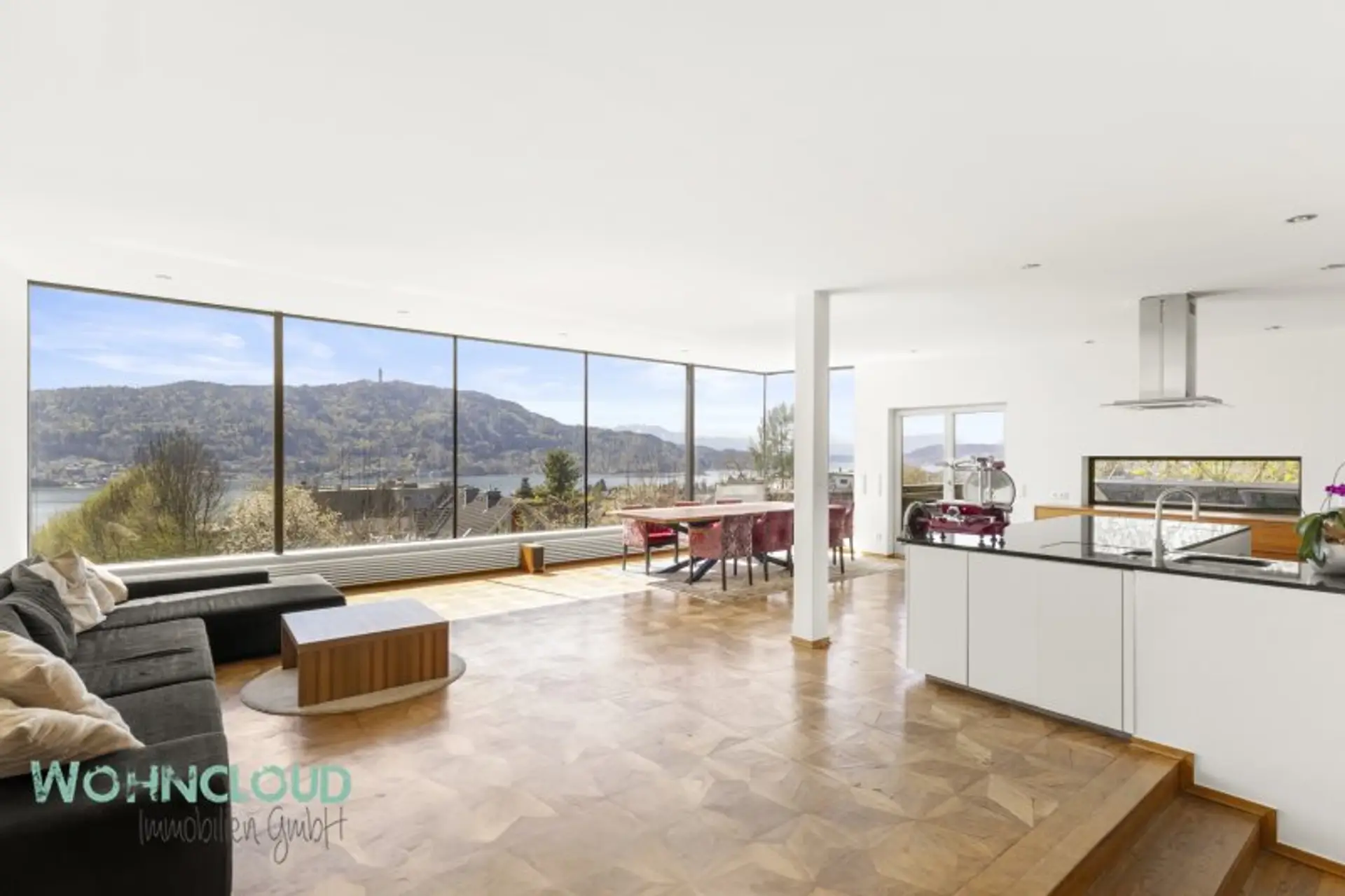 Bereits beim Betreten der Immobilie beeindruckt das durchdachte Raumkonzept: Ein großzügiger, lichtdurchfluteter Wohnbereich mit unglaublichen, beinahe nicht endenwollenden Glasfronten schaffen eine harmonische Verbindung zwischen Innen- und Außenraum. Der offene Wohn- und Essbereich mit integrierter Küche bildet das Herzstück des Hauses und lädt mit direktem Zugang zur Sonnenloggia zu entspannten Stunden mit Blick auf den See ein.
