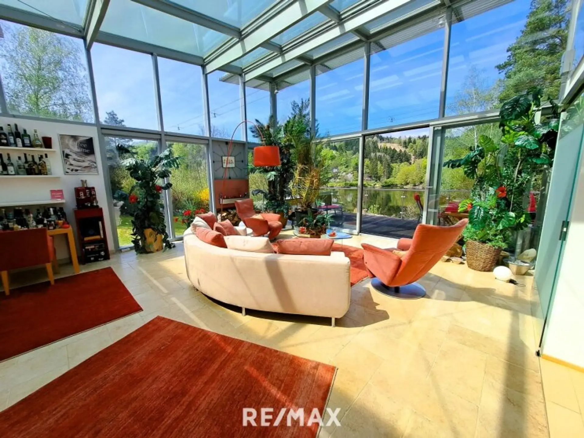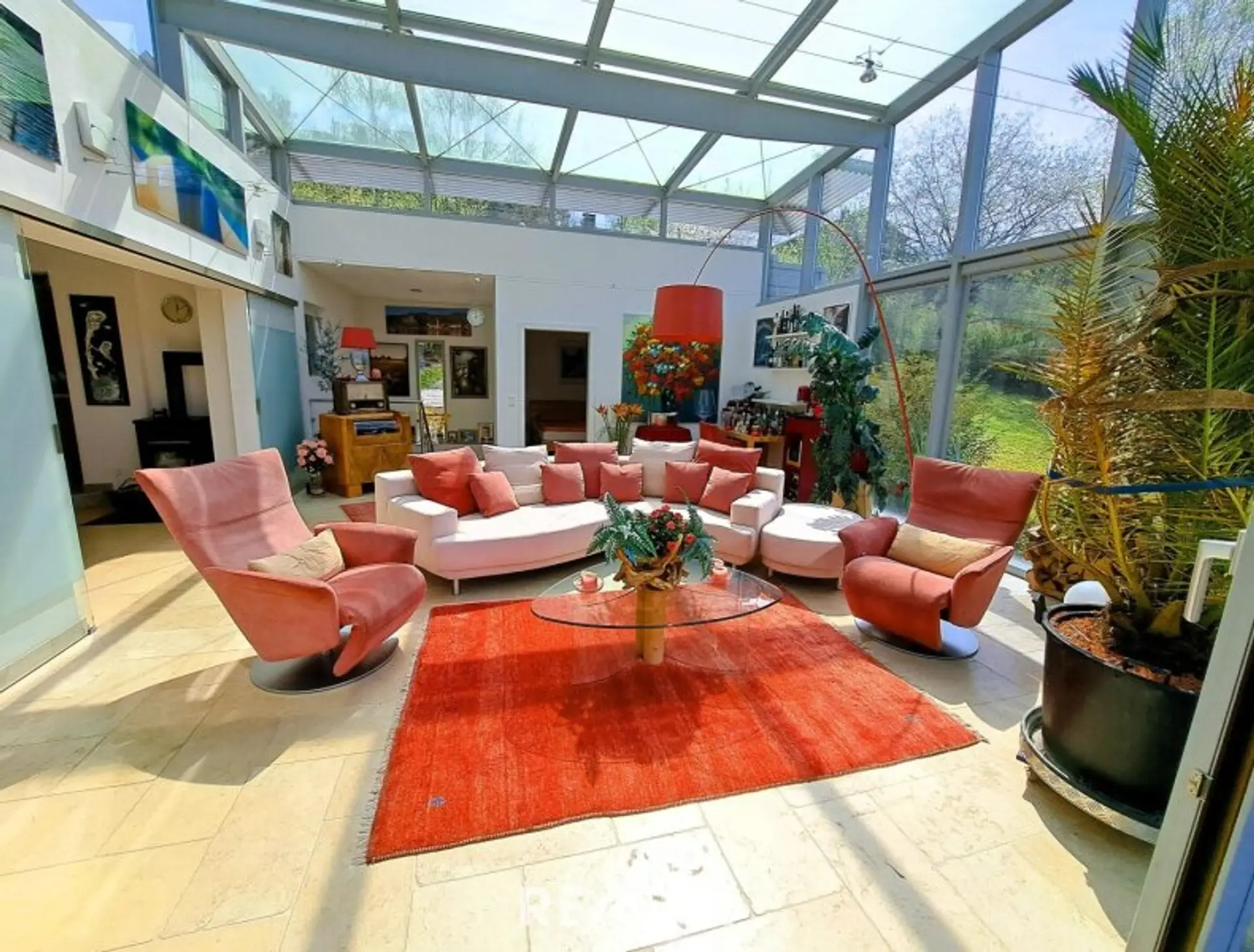 * ein ca. 45 m² großer und 4,5 m hoher Wohnglas-Salon mit 2 Glasseiten und Glasdach - daran angeschlossen