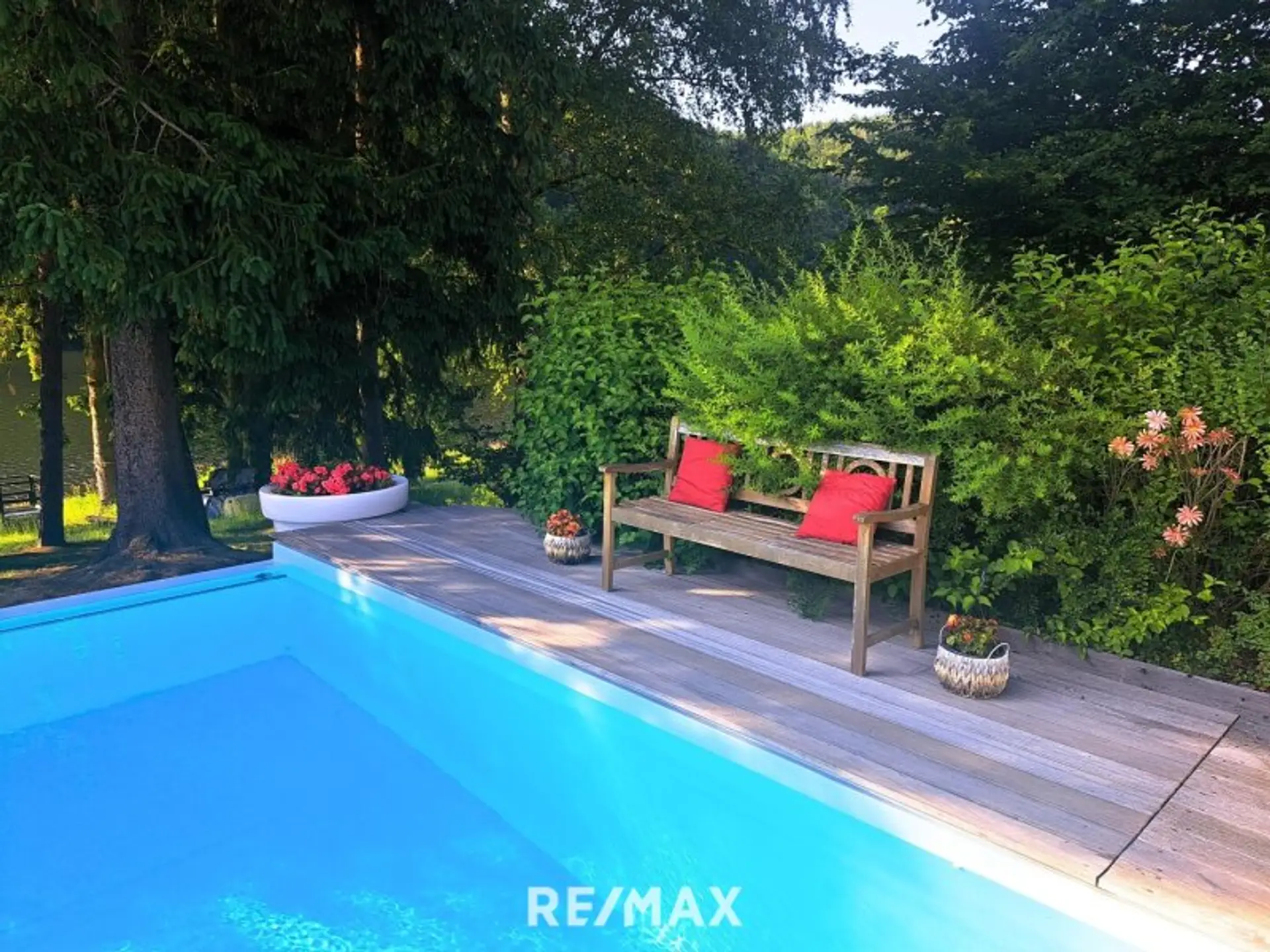 4. Badevergnügen auch an kühleren Tagen verspricht der 12x5 m große, 1,4 m tiefe INFINITY-POOL, ausgestattet mit Unterwasser-Rolldeck und röm. Einstieg. Mittels Erdwärme- und Luftwärmepumpe kann das Wasser bis auf 30 Grad erwärmt werden. Zu Hydromassagen lädt das daneben liegende amerikanische WHIRLPOOL ein.