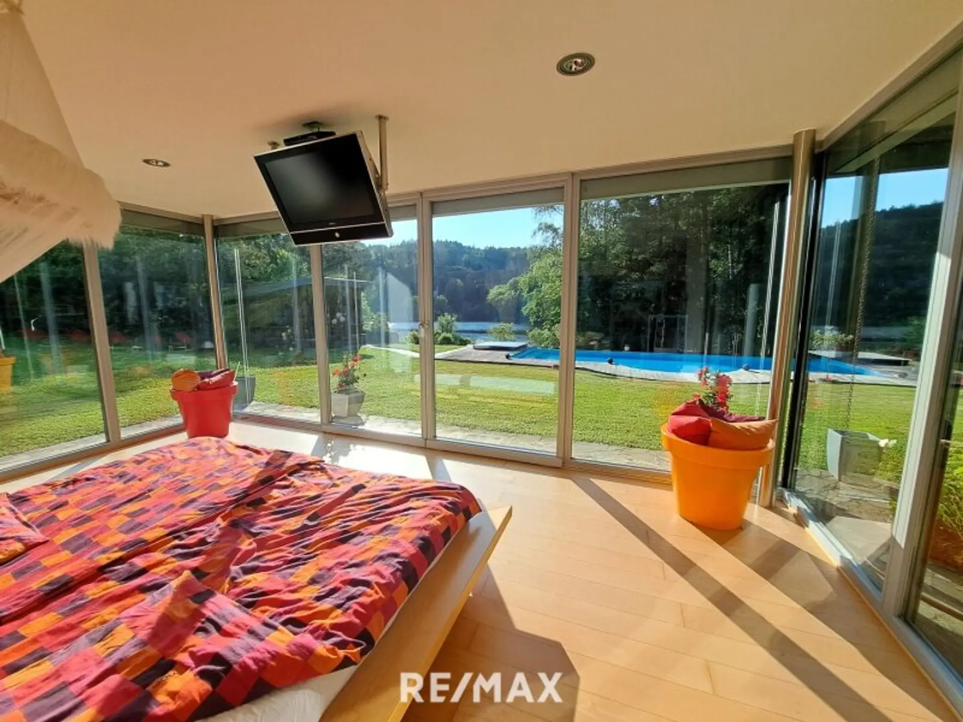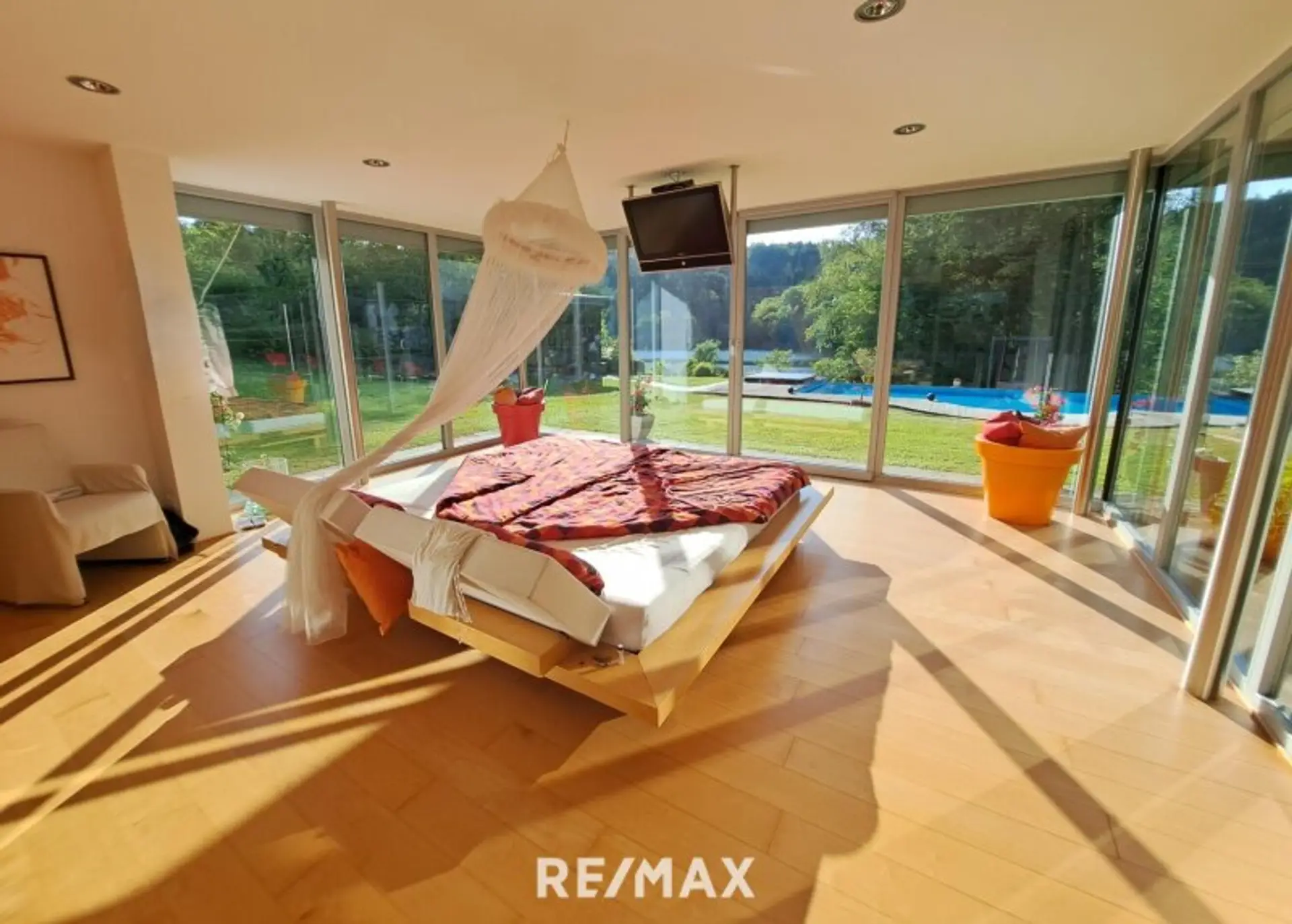 * ein großes Schlafzimmer mit direktem Ausblick zum Garten und See mit 3 Glasseiten und elektrisch bedienbaren Rollläden