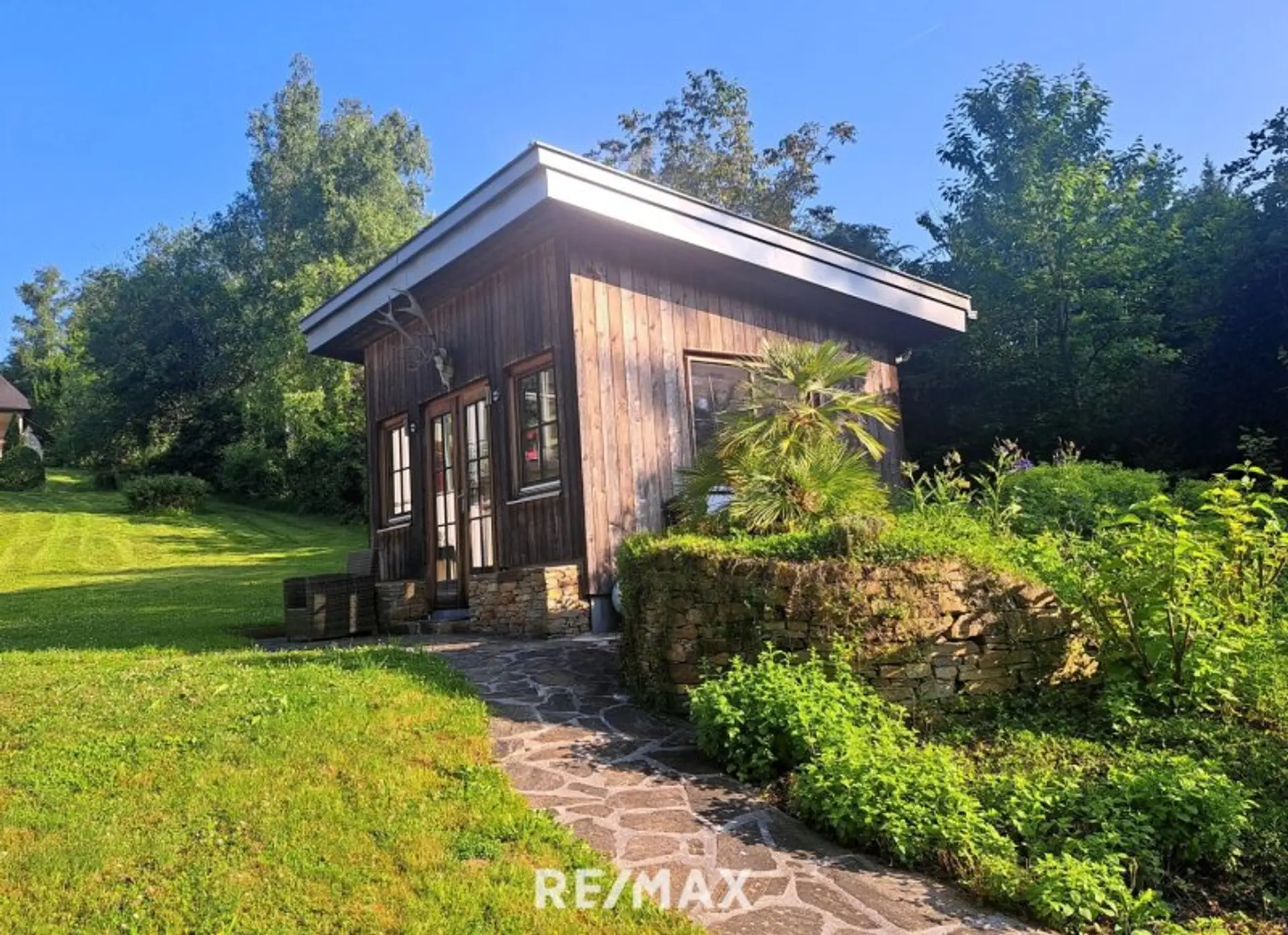 3. Der MUSENTEMPEL à la Gustav Mahler, ein ca. 12 m² großes innen komplett mit Zirbenholz ausgestattetes Holzhaus, ziert die östliche Grundstücksfläche nahe dem Seeufer.