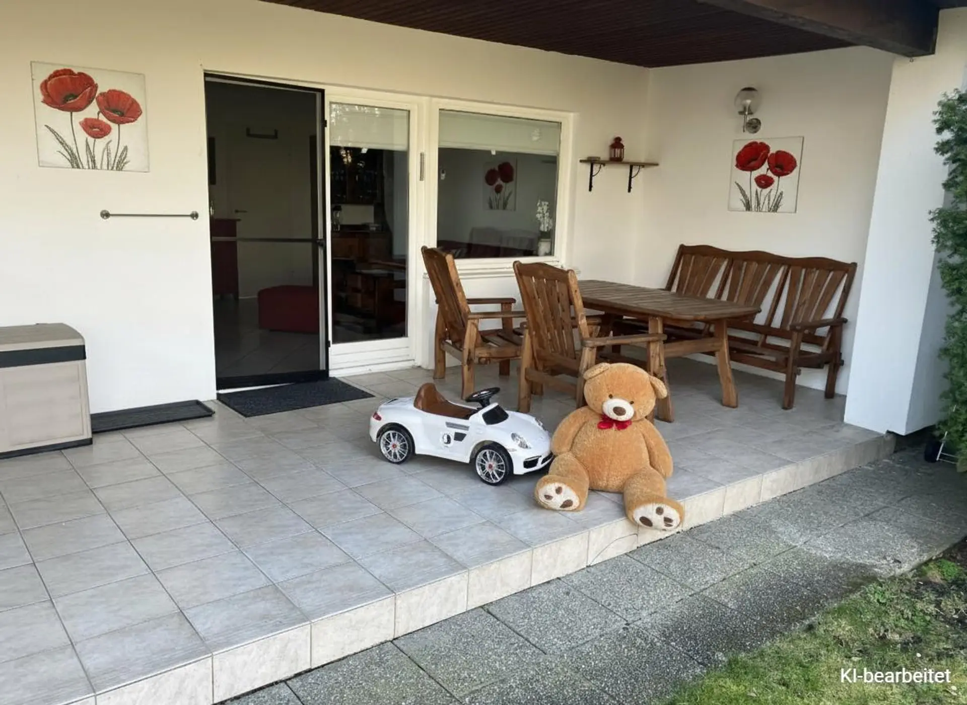 Das Haus gliedert sich in den Vorraum, den Wohnraum mit Küchennische, 1 Schlafzimmer und 1 Gäste- oder Kinderzimmer. Das Bad mit Dusche und Toilette. Vom Wohnzimmer gelangt man über die Terrassentüre auf die ca. 25 m² Loggia. Die netto Wohnfläche beträgt derzeit ca. 47 m² eine wesentliche Erweiterung auf 75 m² ist jedoch möglich. Die Beheizung erfolgt mit el. Heizkörpern aber auch mit dem zentral aufgestellten Specksteinkaminofen mit Sichtfenster. Im Garten gibt es immer Sonne genug, die Terrasse ist nordöstlich ausgerichtet.