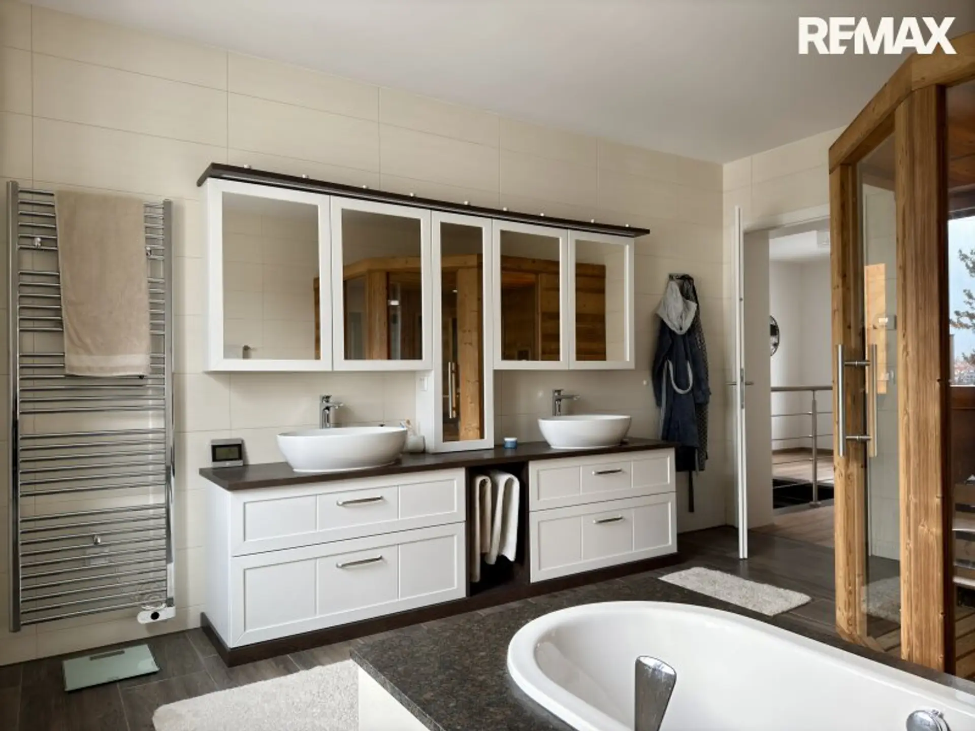 OG: Galerie, zentraler Schrankraum, WC, Badezimmer mit Badewanne, Dusche, Doppelwaschbecken & Sauna, 3 Schlafzimmer, davon 2 mit Blick auf den See