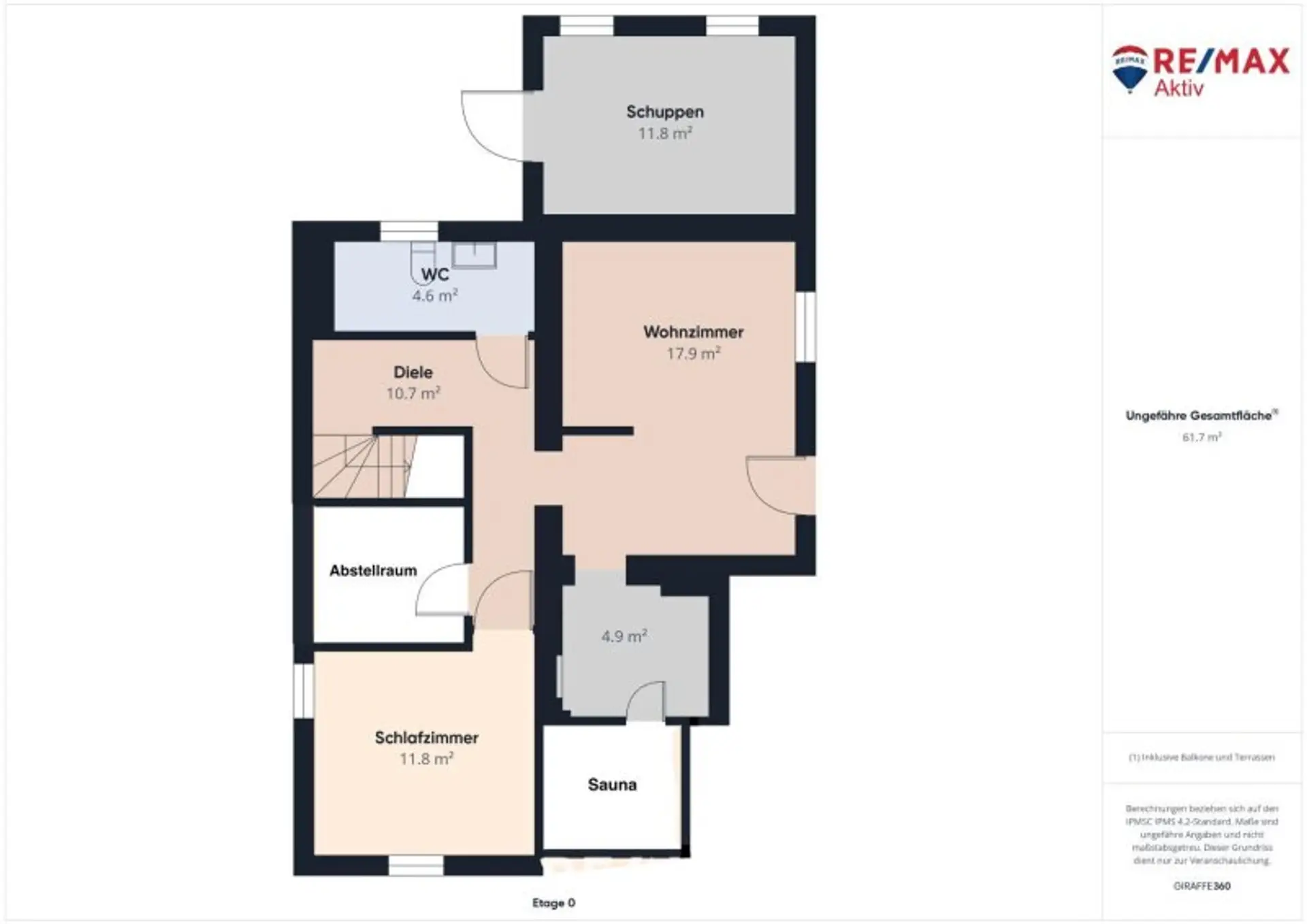 Schlafraum, Wohnzimmer, Diele, Sauna, Waschraum mit WC, Abstellraum
