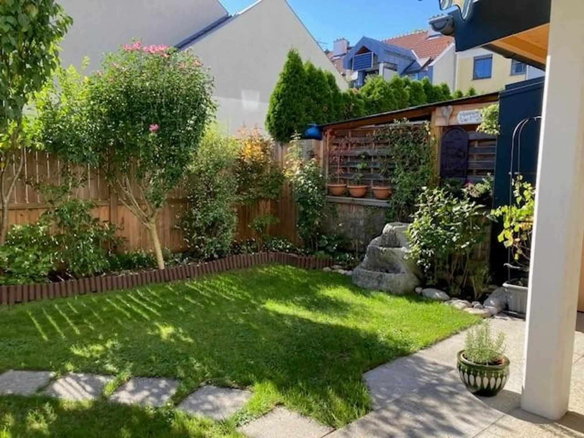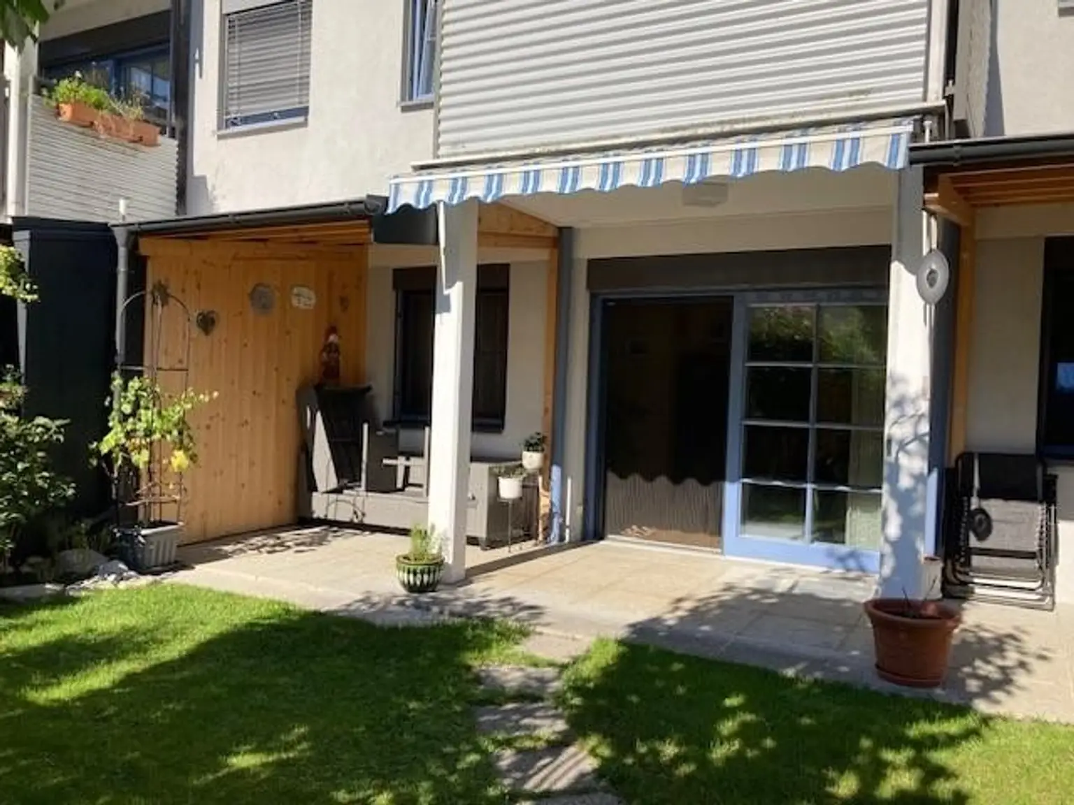 Ausstattung: Einbauküche (inkl. Geräte); Sanitärbereich; Vorzimmer möbliert; Außenjalousien; Insektenschutz; SAT-Anschluss; Parkettböden und Fliesen; Terrasse mit Markise und Wasseranschluss; kl. Gartenhaus.