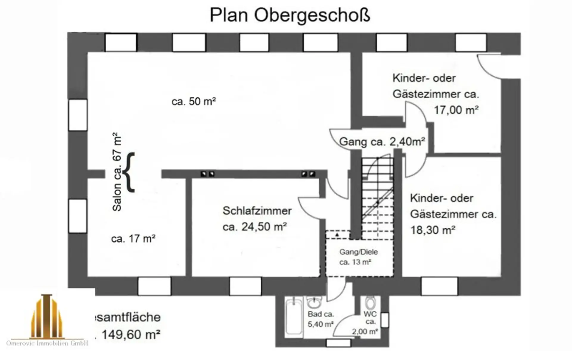 Das Obergeschoß umfasst ca. 149,60 m² und bietet Platz für ein Wohnzimmer, ein Esszimmer bzw. einen Salon, ein Schlafzimmer, zwei Kinder- oder Gästezimmer, ein Bad mit Wanne und Fenster und einem separaten WC, ebenfalls mit Fenster.