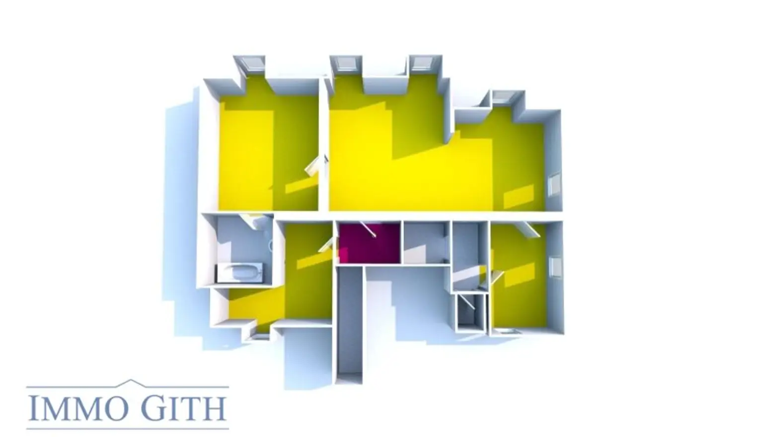 Die Wohnung befindet sich im 3. Stock und bietet 2 großzügige Eingangsbereiche, 1 großes Wohnzimmer, 2 geräumige Schlafzimmer bzw. Bürozimmer, 1 separate Küche, 2 moderne Bäder mit Badewanne und Waschmaschinenanschluss sowie 2 getrennte WCs.