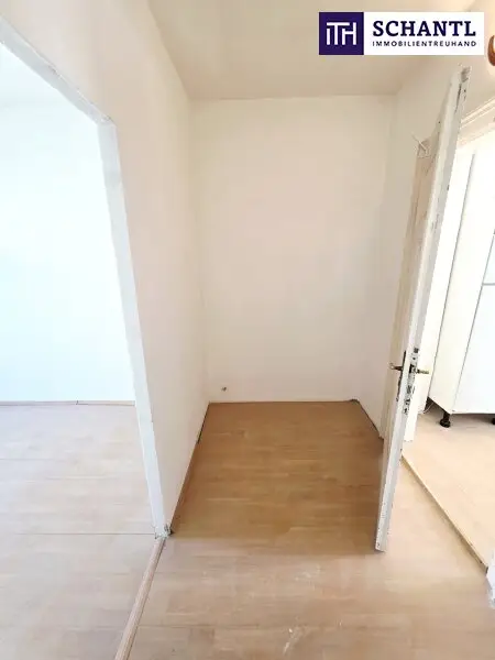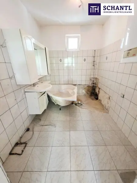 Ihre neue Wohnung hat Renovierungsbedarf und teilt sich in einen kleinen Vorraum, ein separates WC, einen geräumigen Küchenbereich mit Platz für einen kleinen Esstisch, eine kuscheliges Schlafzimmer, ein Badezimmer mit Badewanne und Waschmaschinenanschluss sowie ein großes Wohn-Esszimmer.