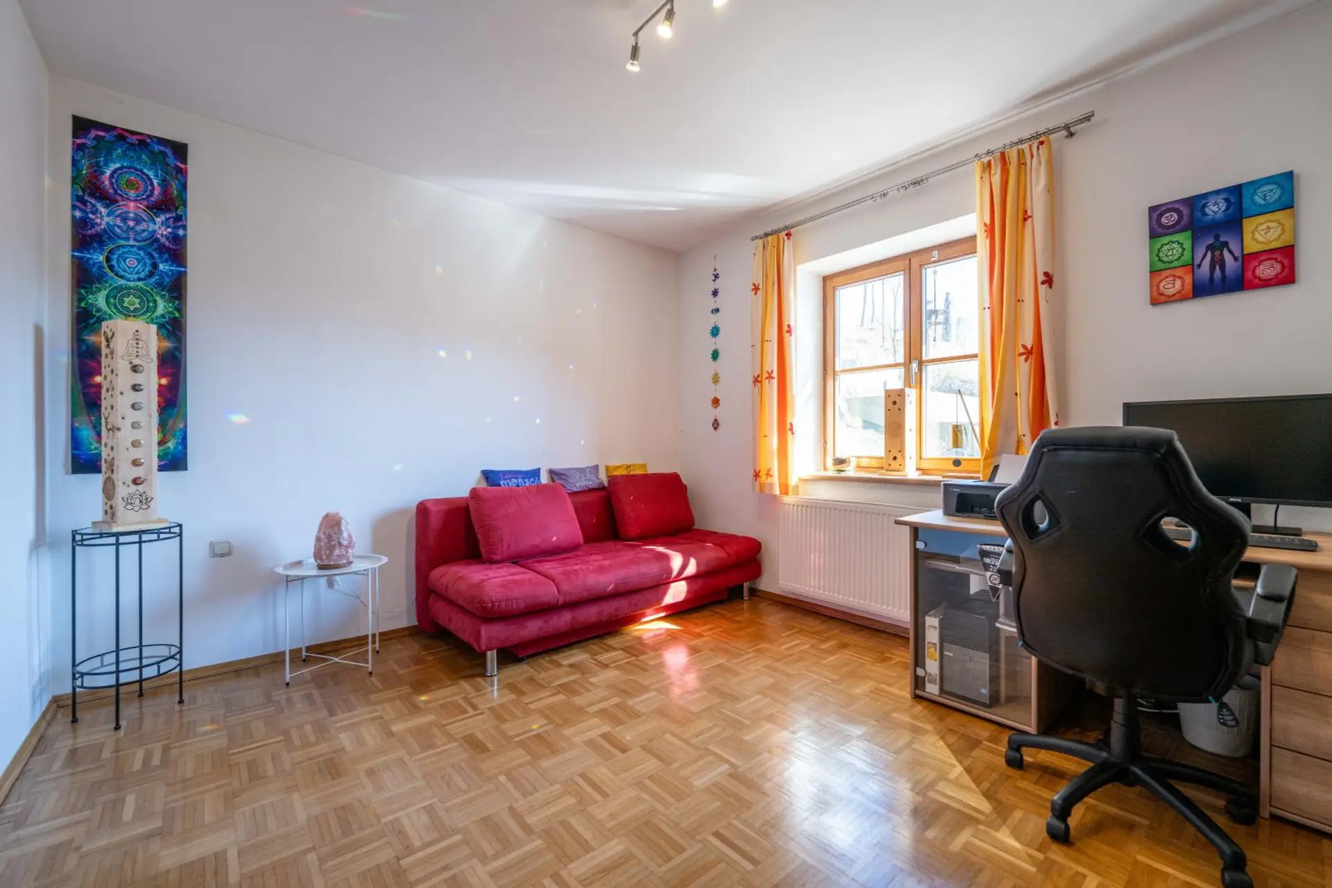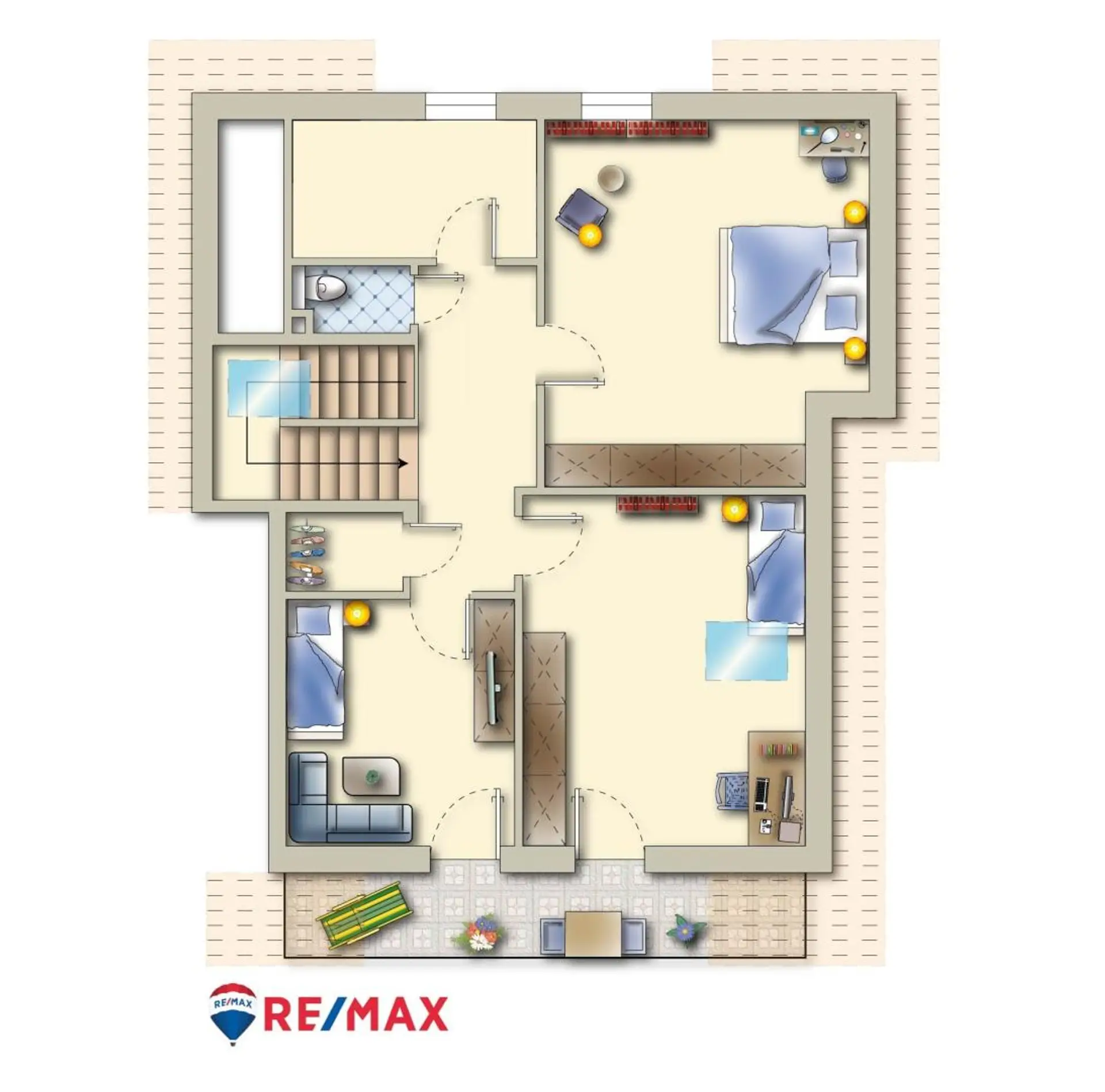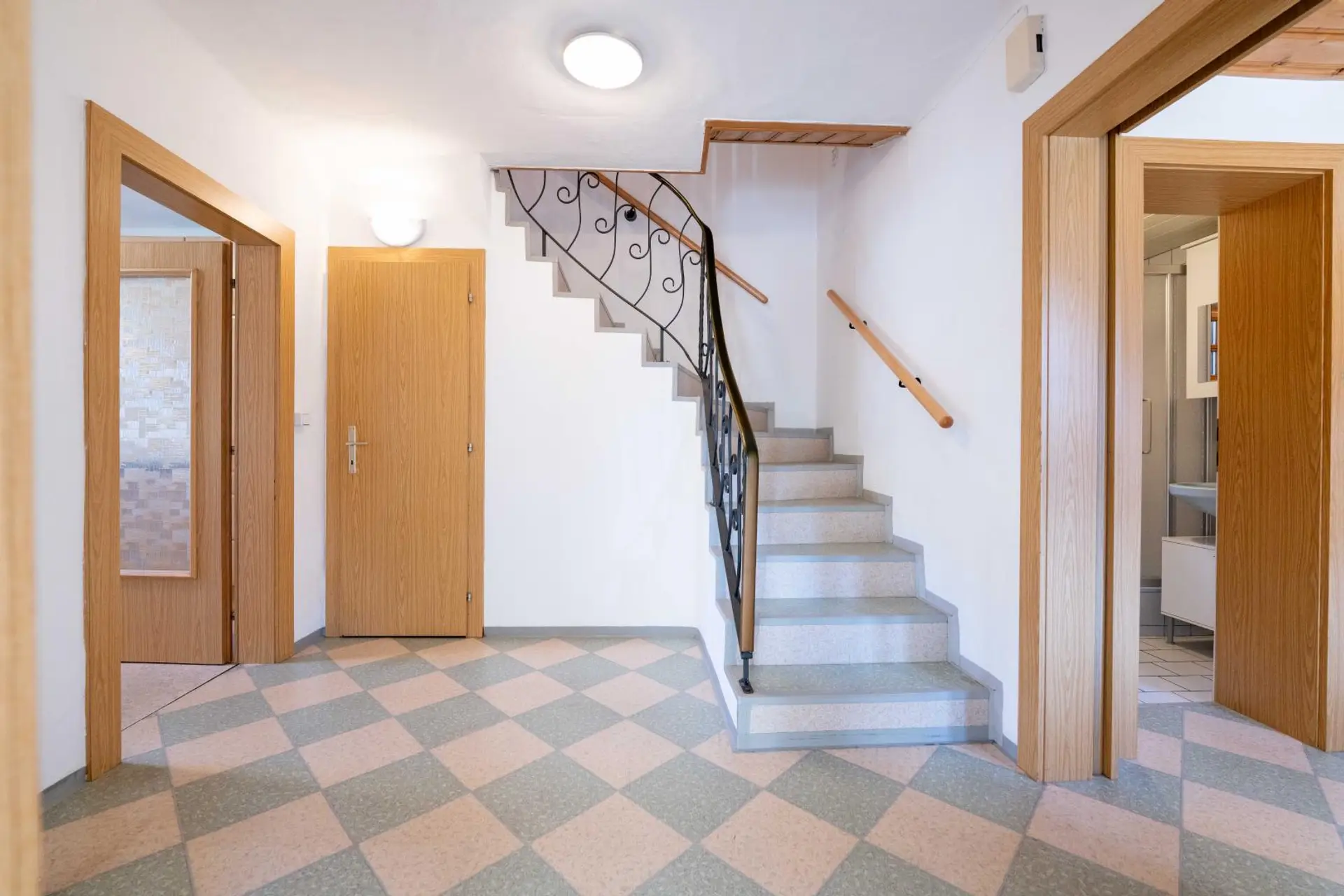 Das Obergeschoss bietet einen Vorraum, drei Zimmer, ein Badezimmer mit WC sowie einen Abstellraum. Von zwei der Zimmer aus gelangt man auf den kleinen Balkon, während das dritte Zimmer direkten Zugang zur großzügigen Terrasse bietet, die zum Entspannen im Freien einlädt.